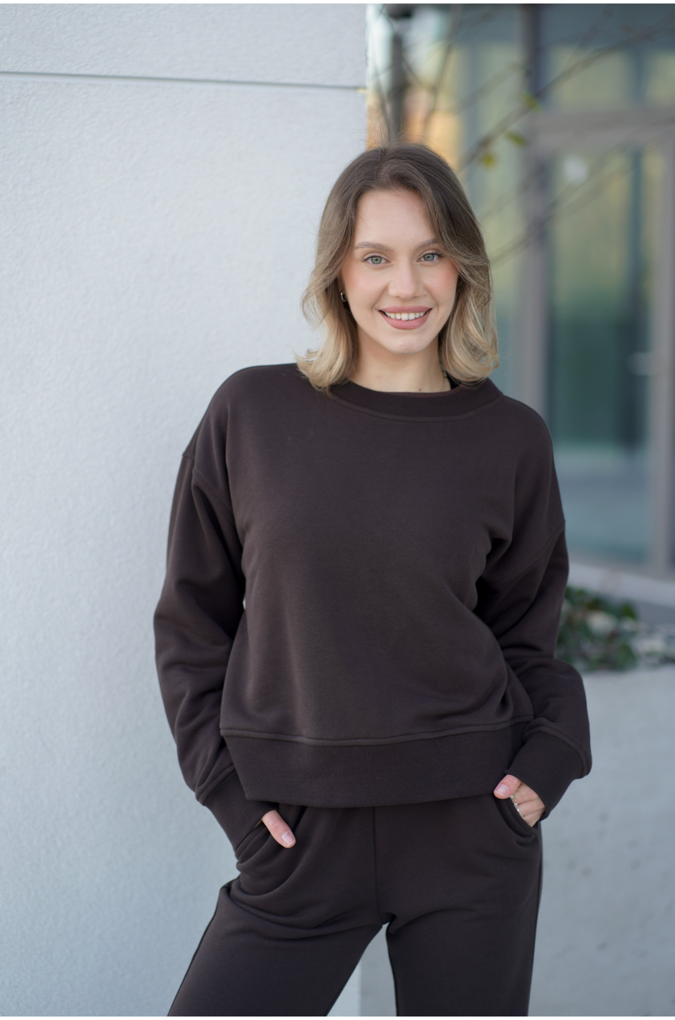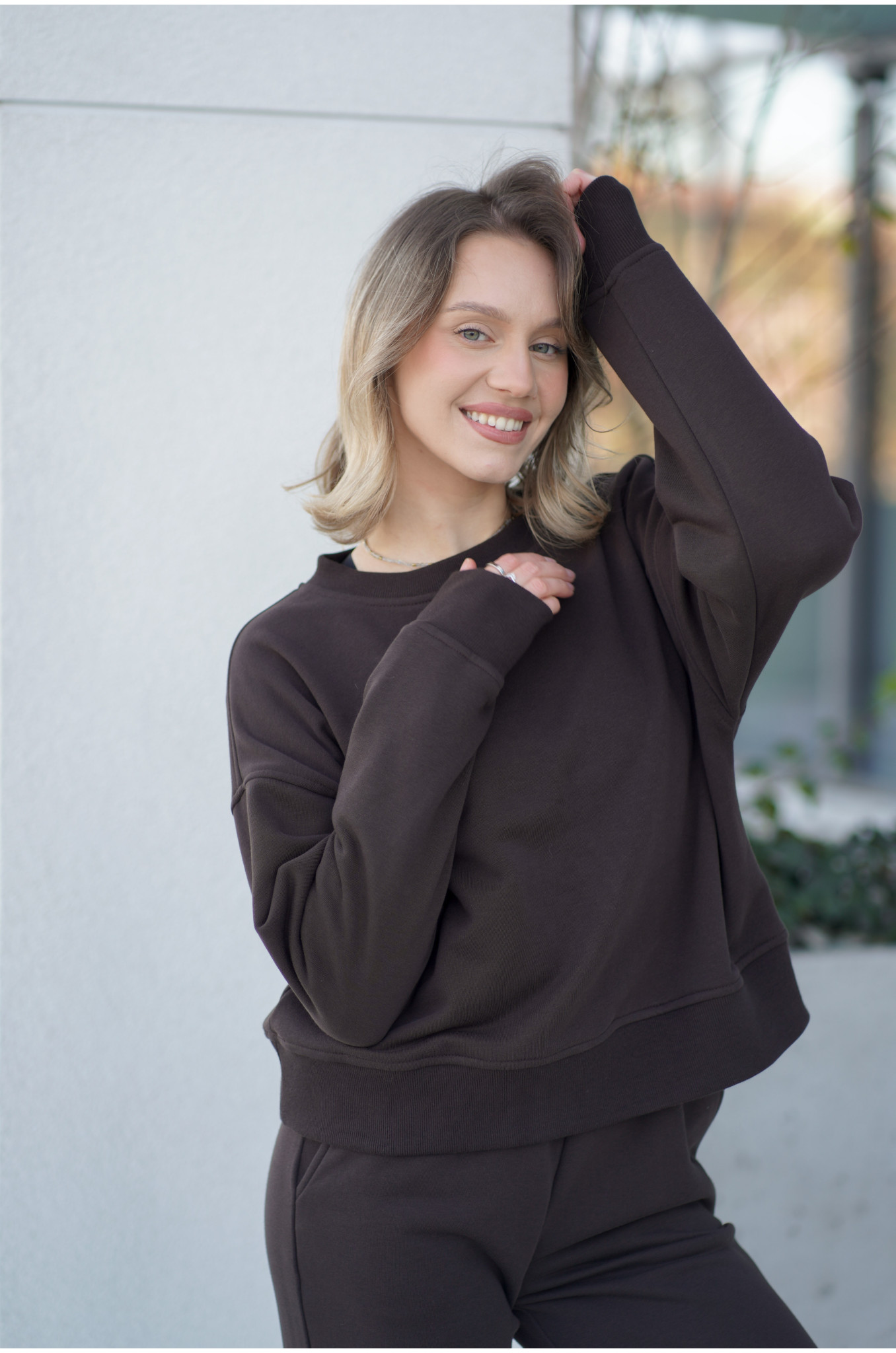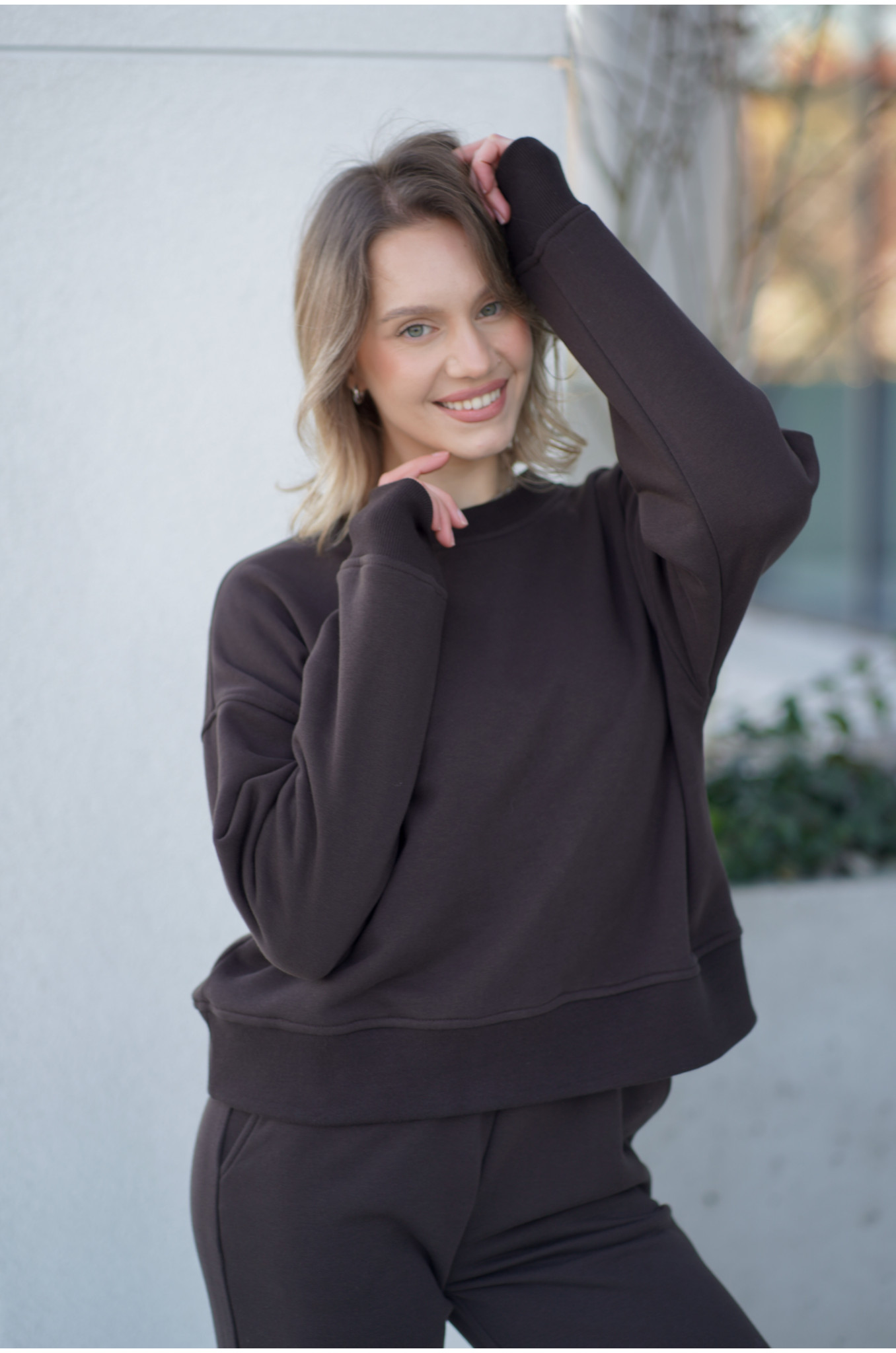 Bluza ma lekko obniżoną linię ramion, co nadaje jej swobodnego, nowoczesnego charakteru. Ściągacze przy rękawach, dole i dekolcie subtelnie podkreślają formę, tworząc minimalistyczny, dopracowany look.