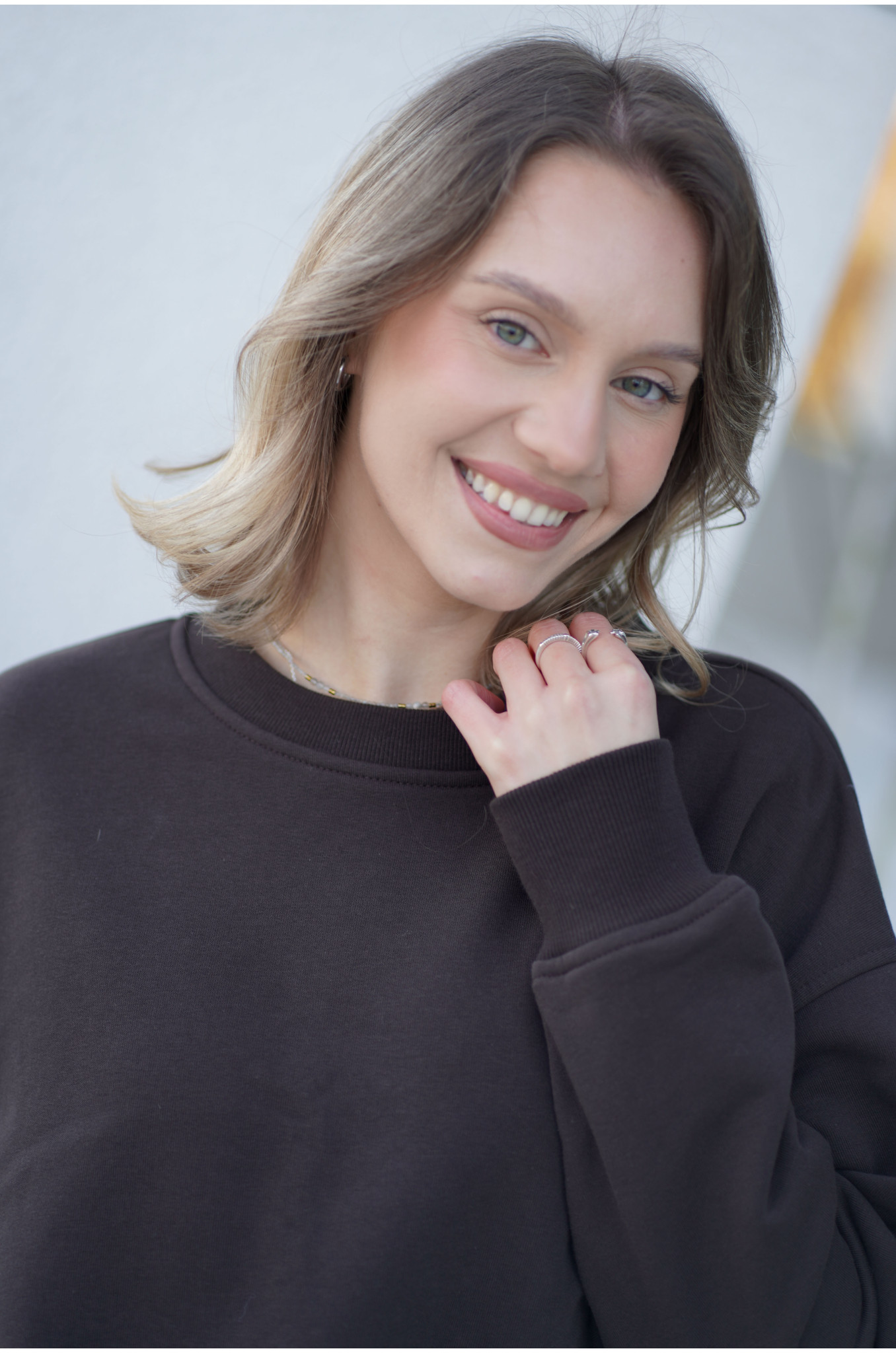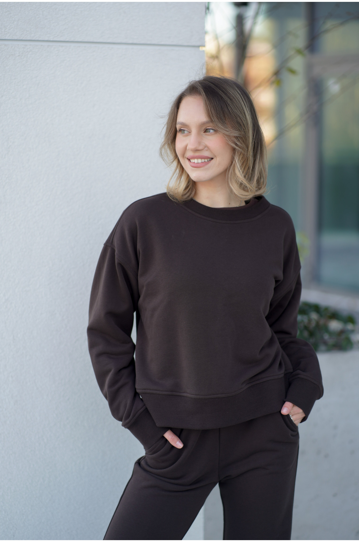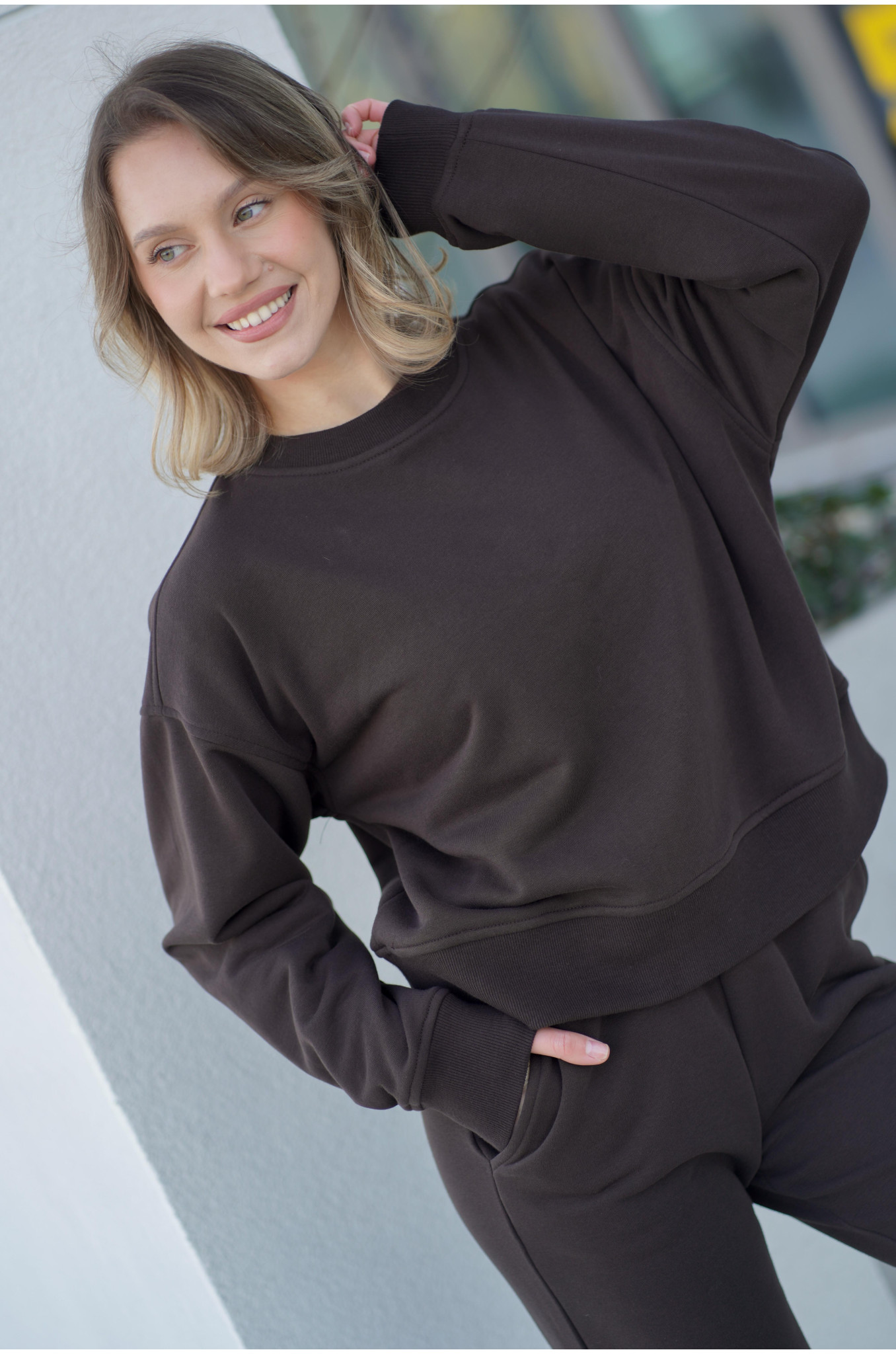 Bluza ma lekko obniżoną linię ramion, co nadaje jej swobodnego, nowoczesnego charakteru. Ściągacze przy rękawach, dole i dekolcie subtelnie podkreślają formę, tworząc minimalistyczny, dopracowany look.