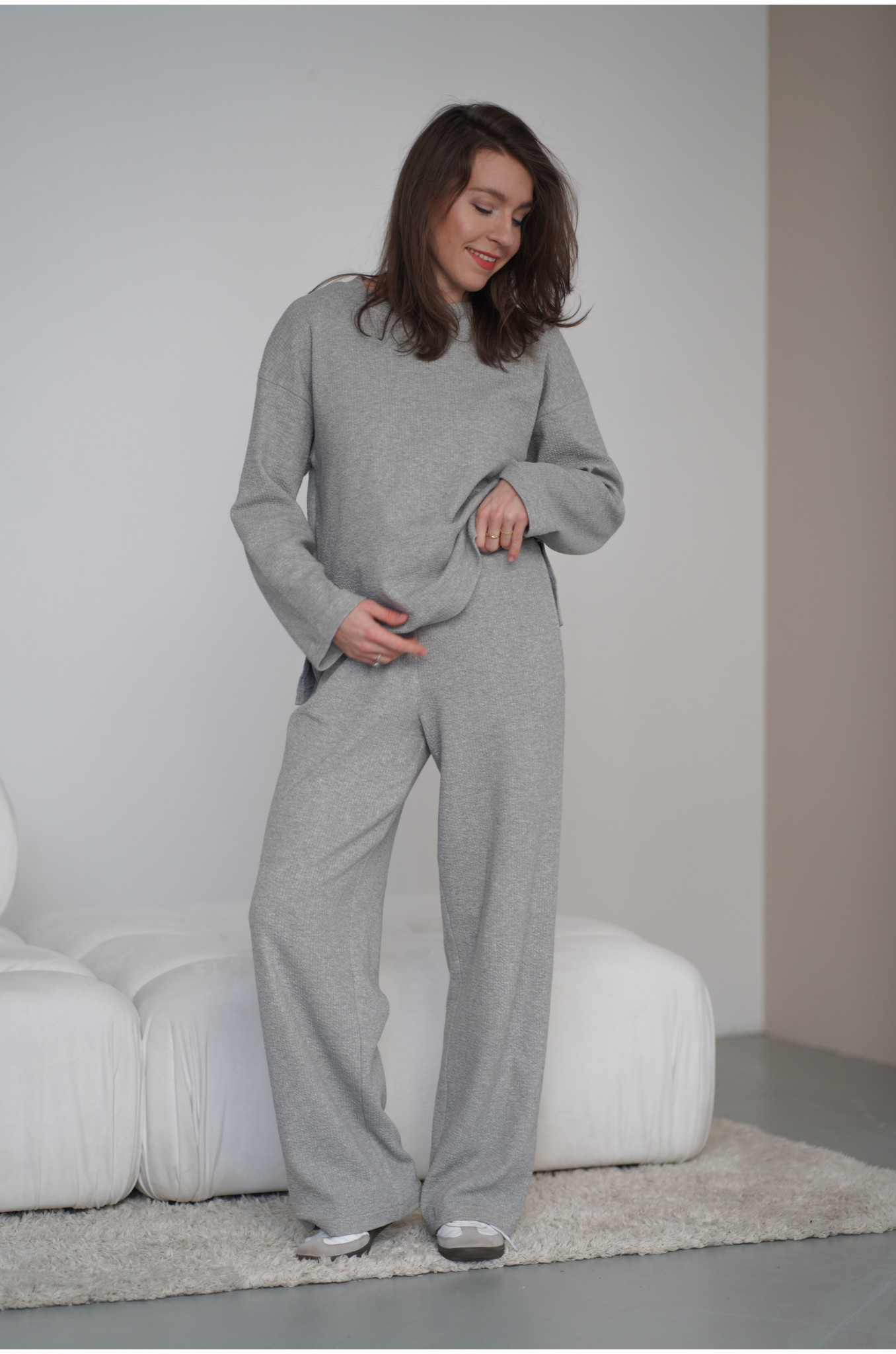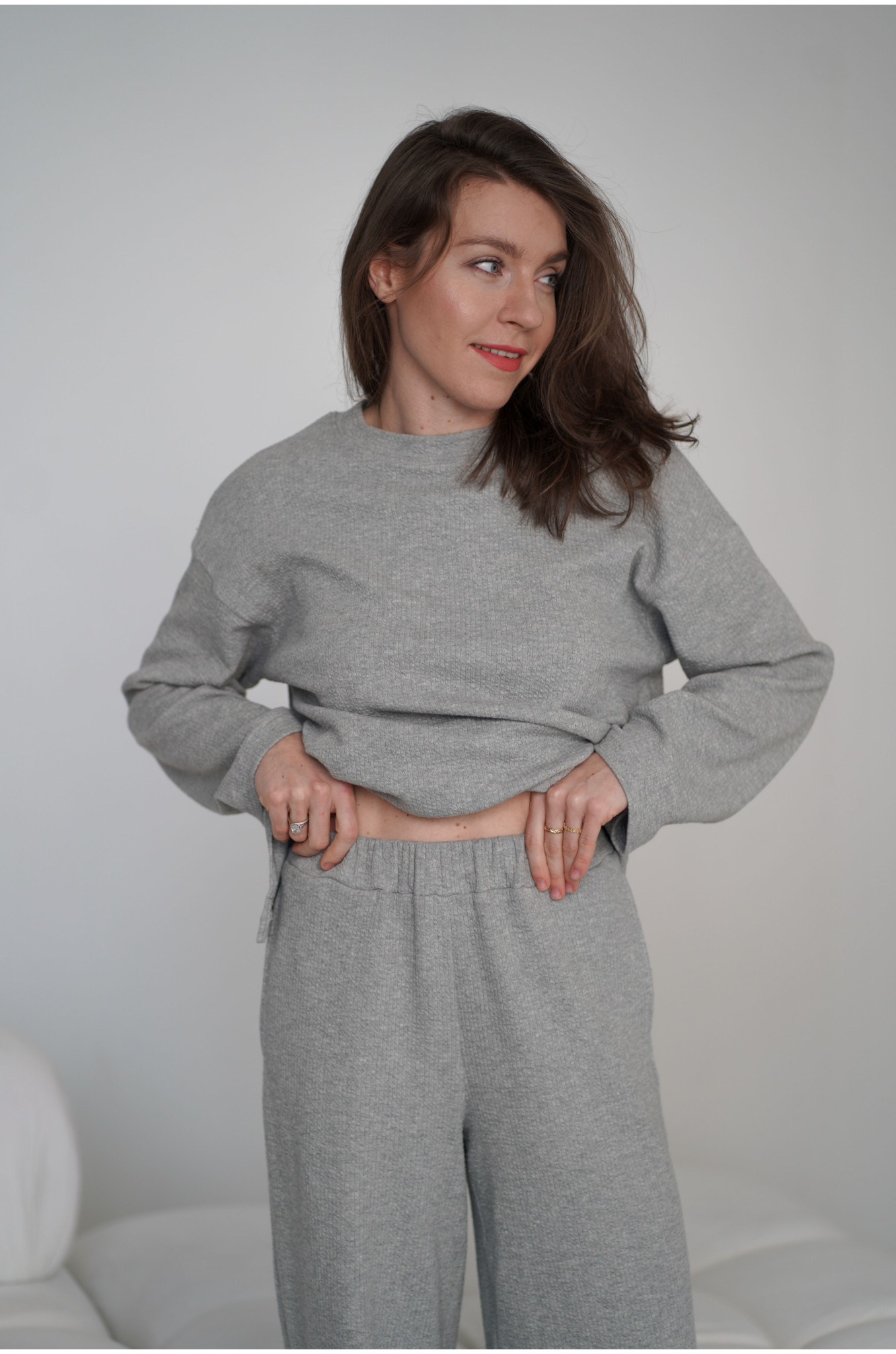 Bluza Knitted Grey to idealne połączenie komfortu, jakości i ponadczasowego stylu. Wykonana z miękkiej, przyjemnej w dotyku dzianiny zapewnia wygodę noszenia przez cały dzień. Naturalny materiał jest przewiewny, delikatnie elastyczny i przyjazny dla skóry, dzięki czemu bluza świetnie sprawdzi się zarówno na co dzień, jak i w domowym wydaniu.