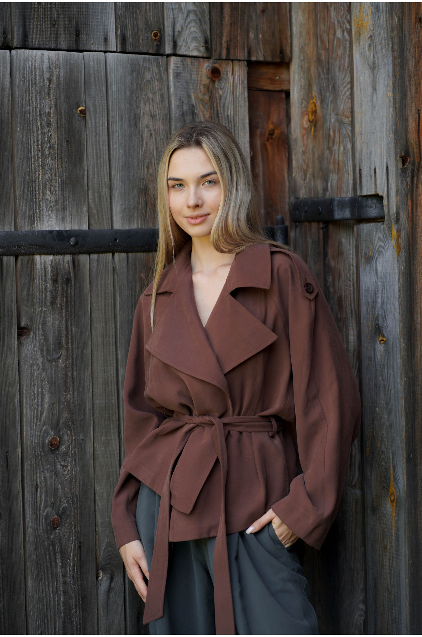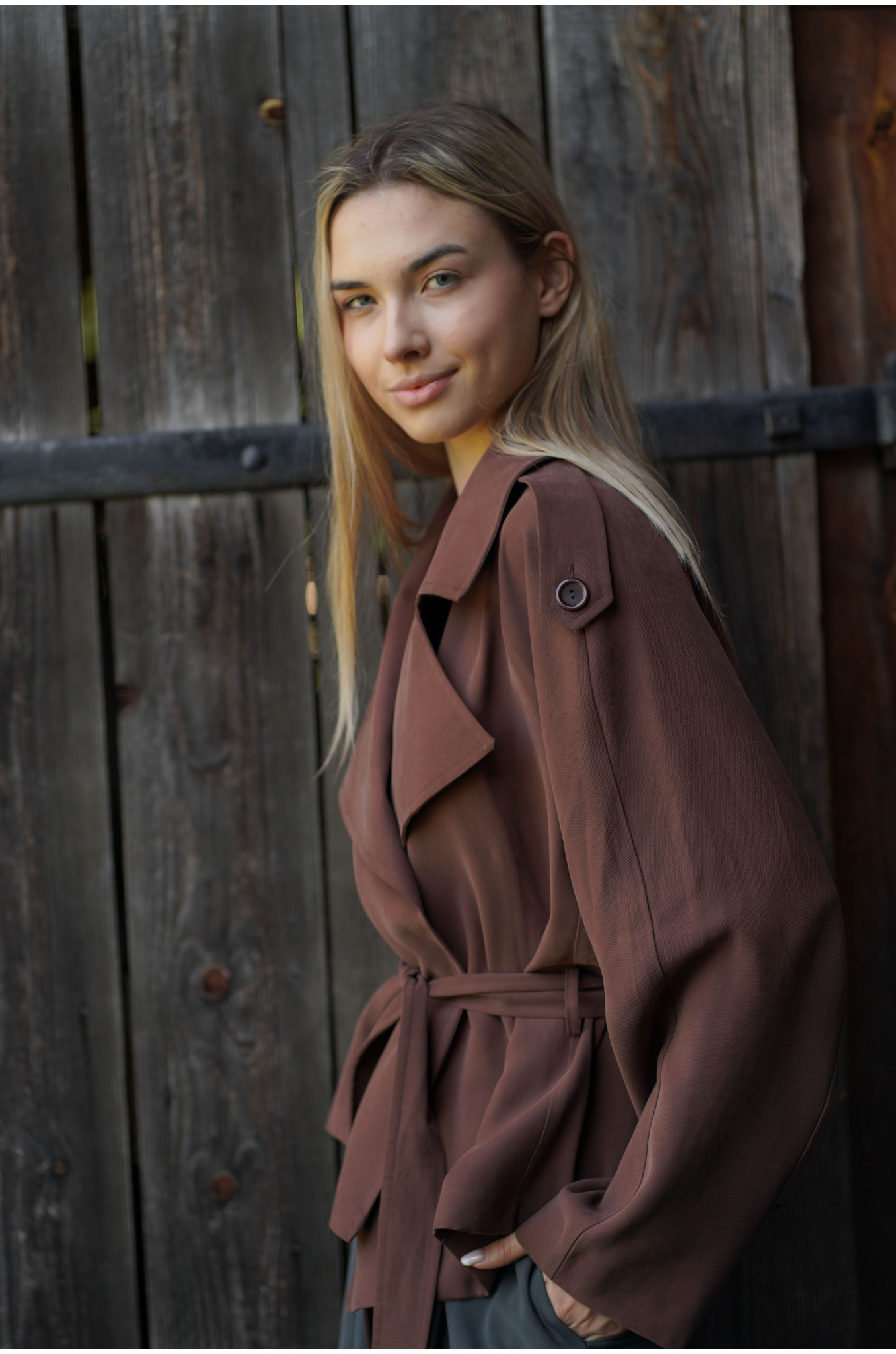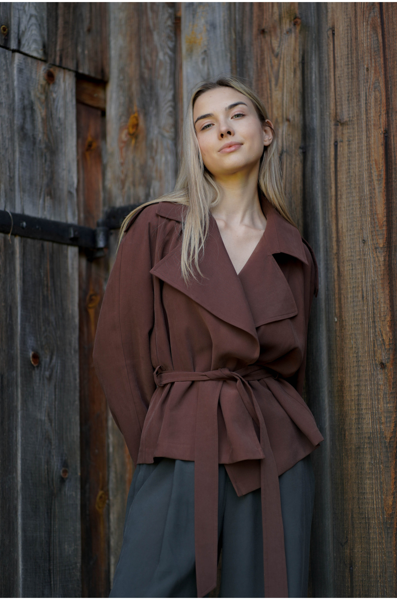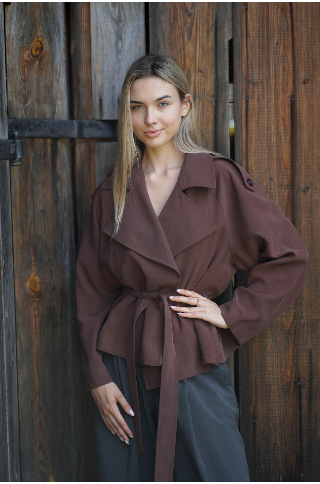 Kurtka Terra Chocolate to współczesna interpretacja klasycznego trencza w krótszej formie. Uszyta z lejącej tkaniny w odcieniu głębokiej czekolady, wyróżnia się kobiecym fasonem raglan oraz dużym, efektownym kołnierzem. W talii znajduje się pasek ze szlufkami, który pozwala podkreślić sylwetkę i nadać całości eleganckich proporcji.