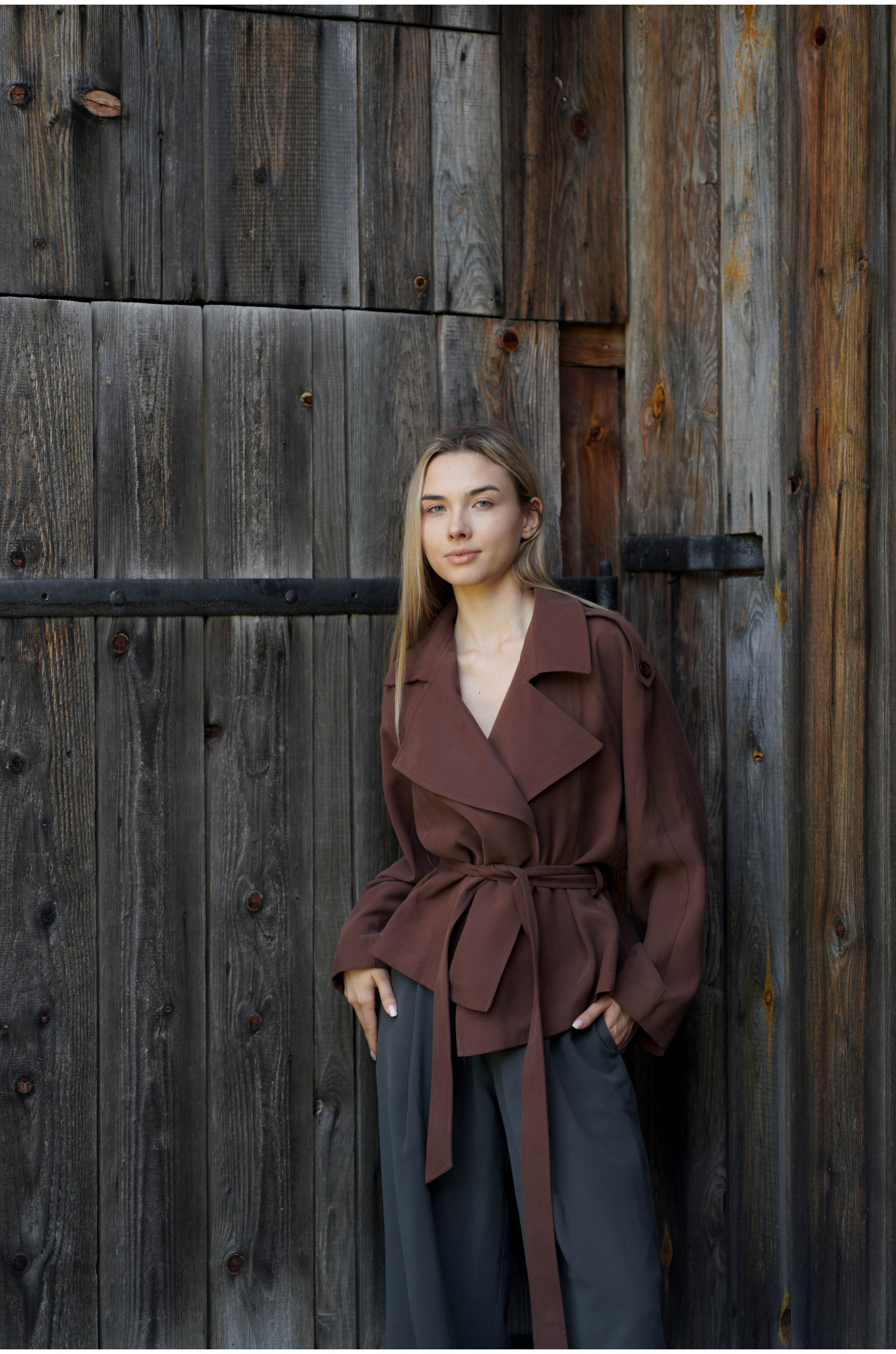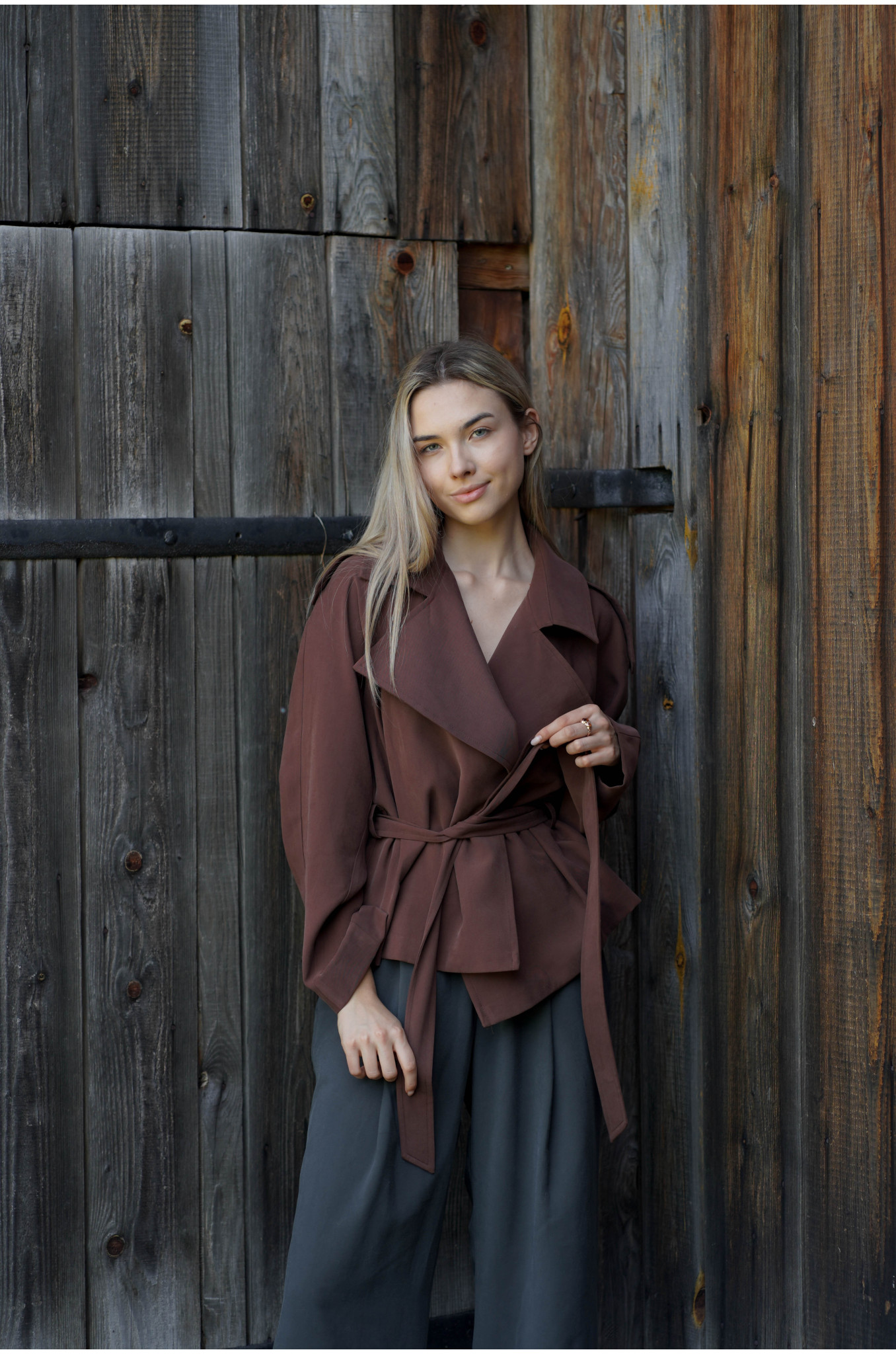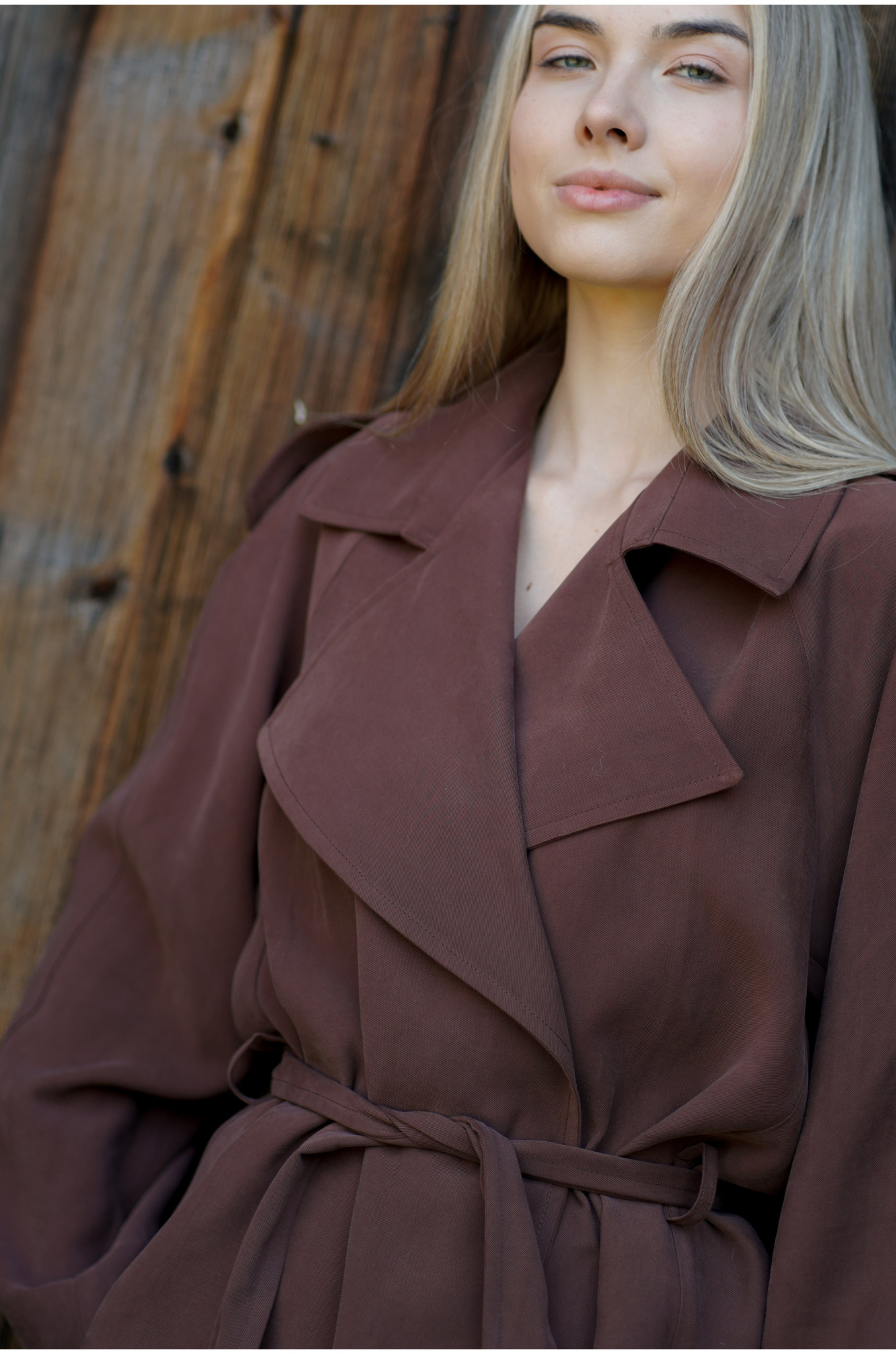 Kurtka Terra Chocolate to współczesna interpretacja klasycznego trencza w krótszej formie. Uszyta z lejącej tkaniny w odcieniu głębokiej czekolady, wyróżnia się kobiecym fasonem raglan oraz dużym, efektownym kołnierzem. W talii znajduje się pasek ze szlufkami, który pozwala podkreślić sylwetkę i nadać całości eleganckich proporcji.