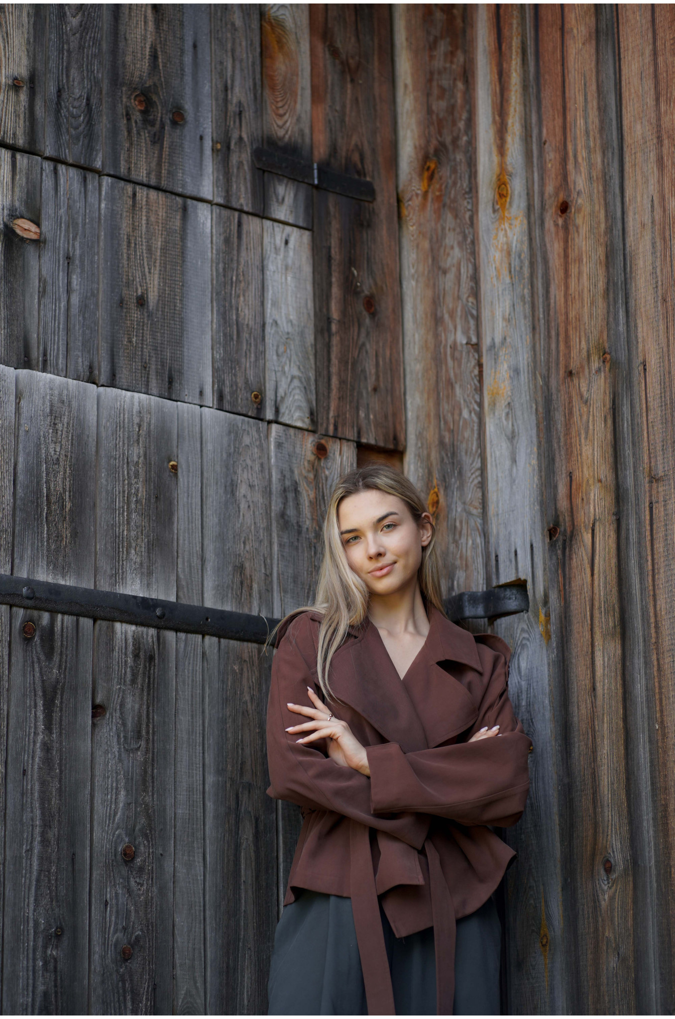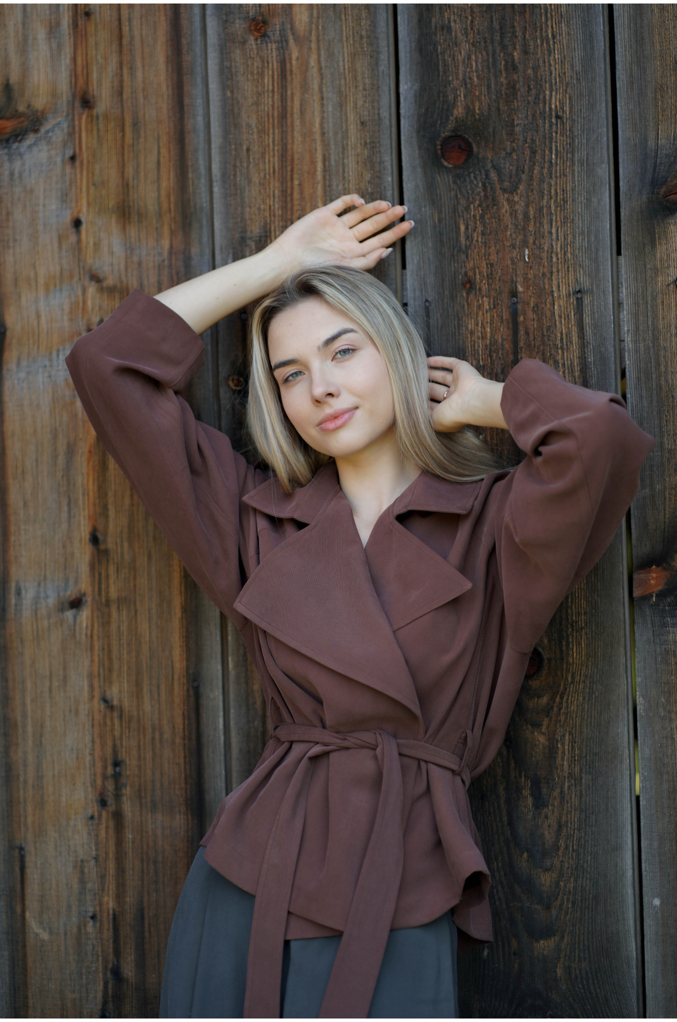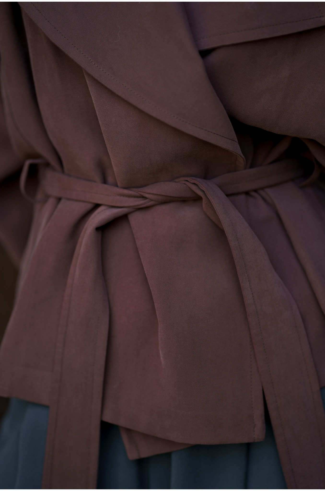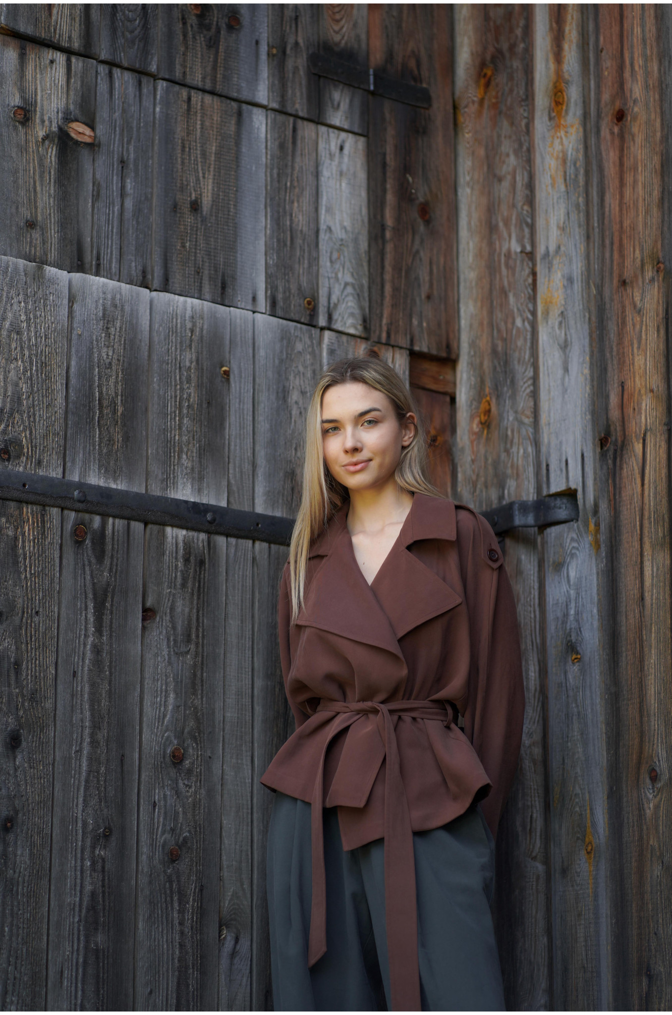 Kurtka Terra Chocolate to współczesna interpretacja klasycznego trencza w krótszej formie. Uszyta z lejącej tkaniny w odcieniu głębokiej czekolady, wyróżnia się kobiecym fasonem raglan oraz dużym, efektownym kołnierzem. W talii znajduje się pasek ze szlufkami, który pozwala podkreślić sylwetkę i nadać całości eleganckich proporcji.