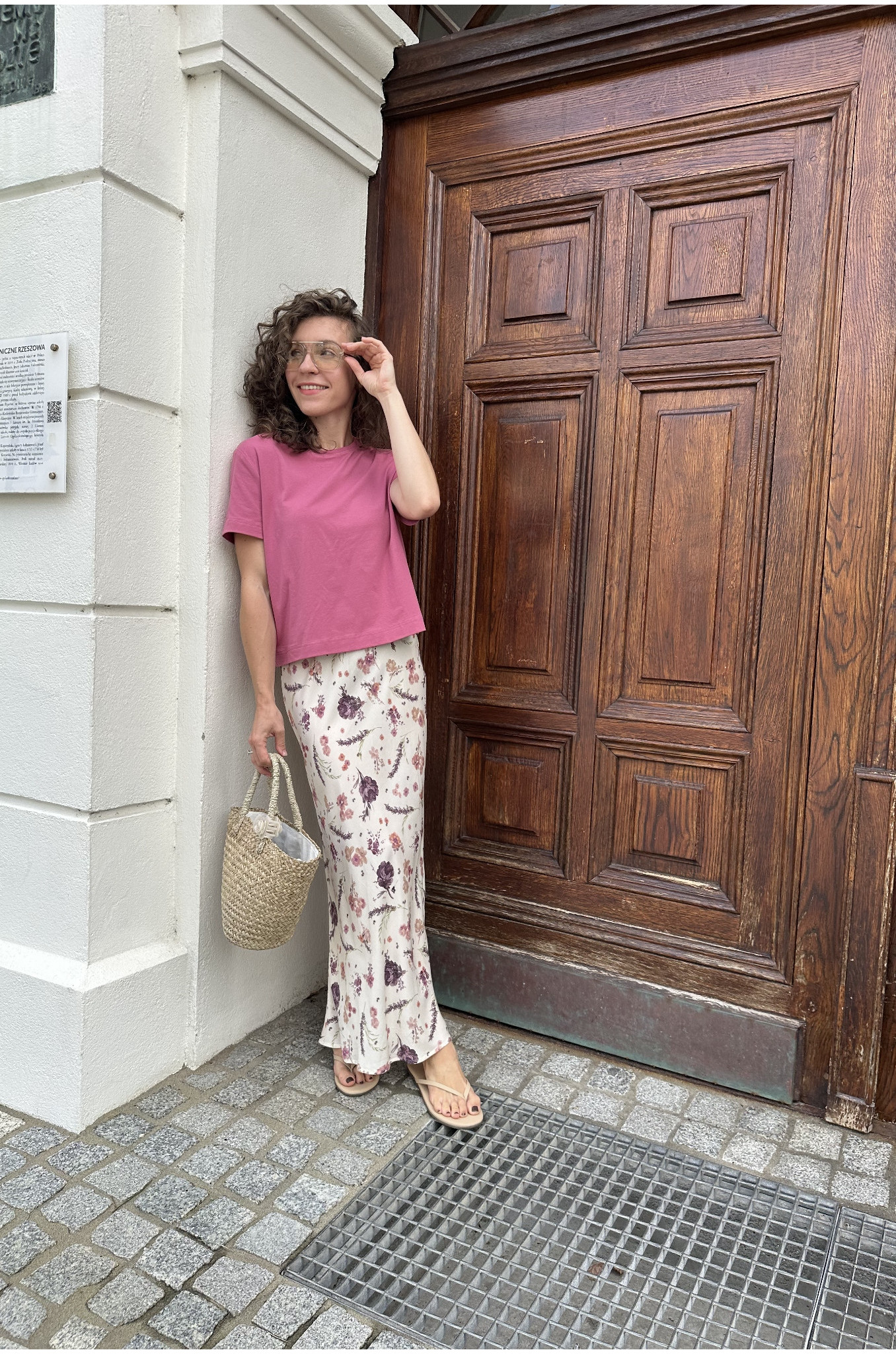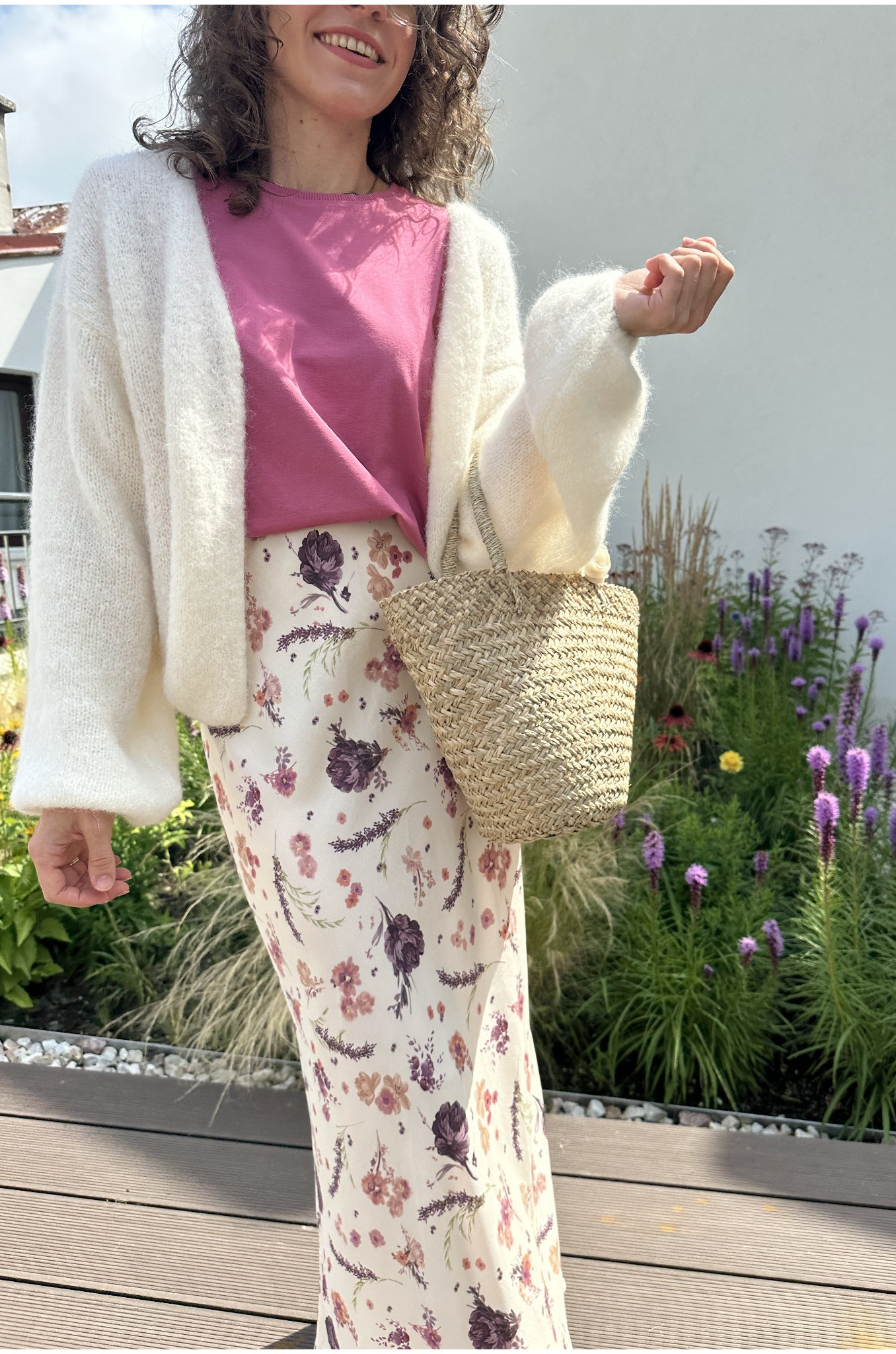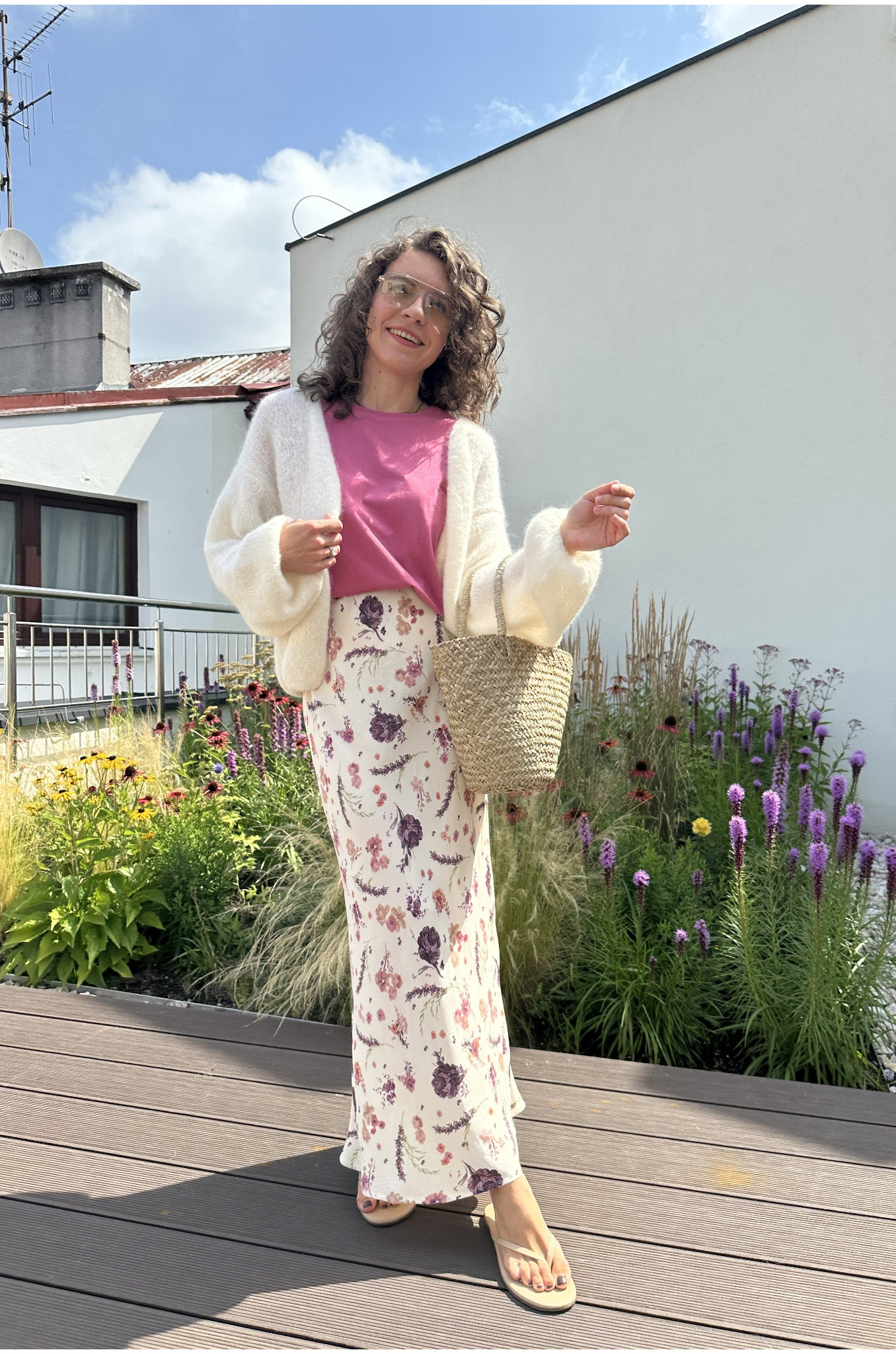 Zanurz się w romantycznym klimacie z naszą długą spódnicą ze skosu w delikatny, kwiatowy print. Wzór w odcieniach wrzosu, pudrowego różu i subtelnego fioletu na kremowym tle dodaje lekkości i kobiecego uroku. Lekki, lejący materiał pięknie układa się na sylwetce, a cięcie po skosie nadaje naturalnej miękkości w ruchu.