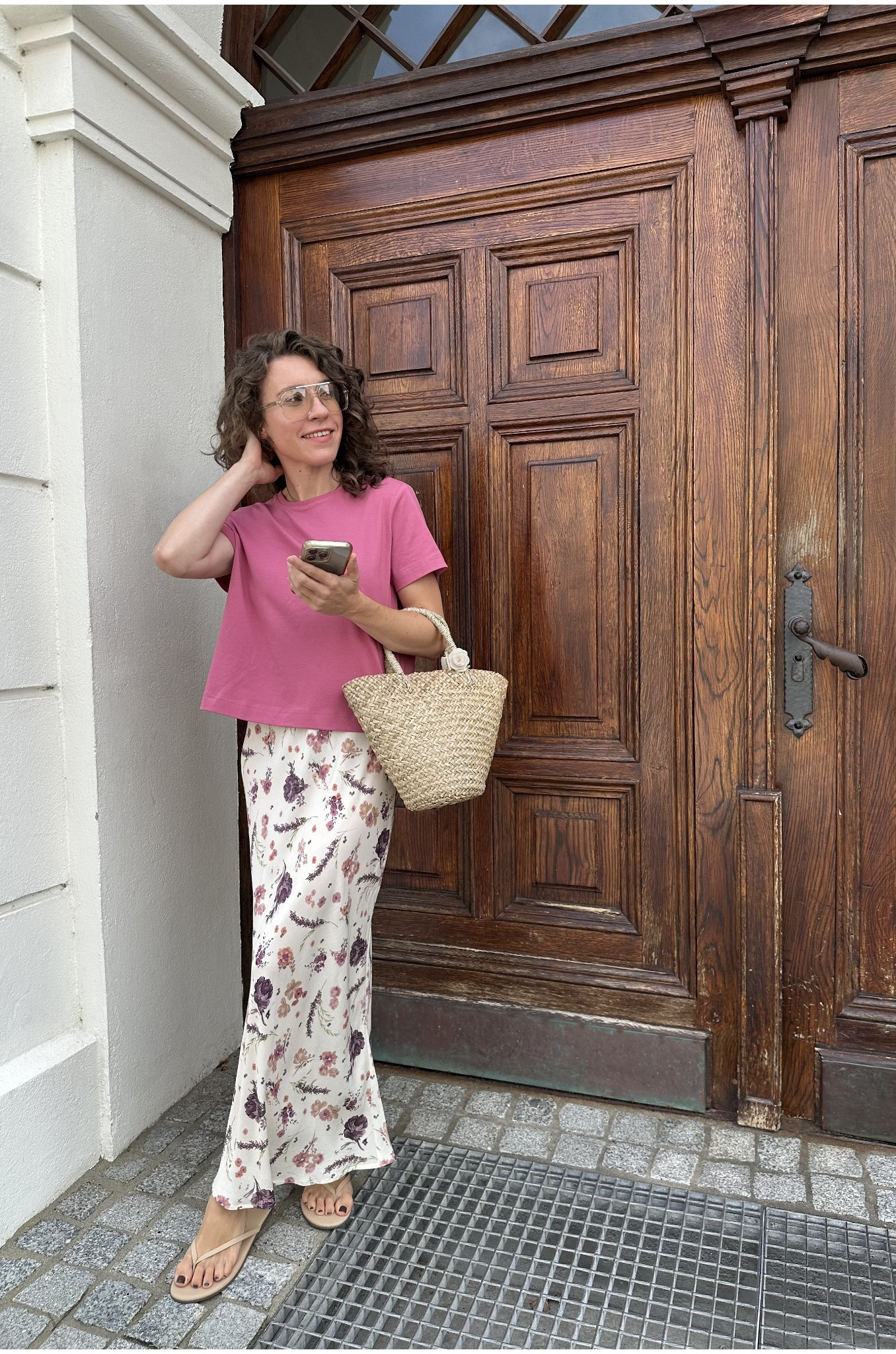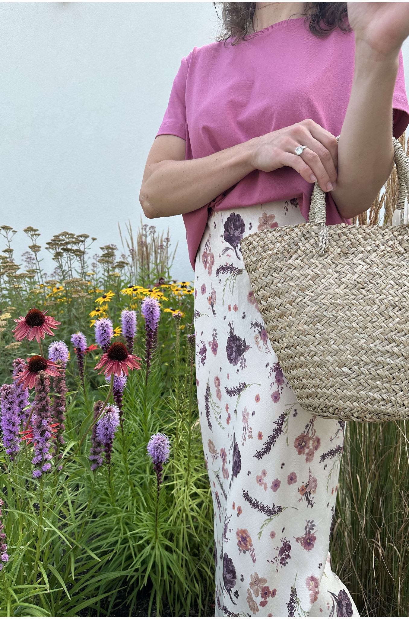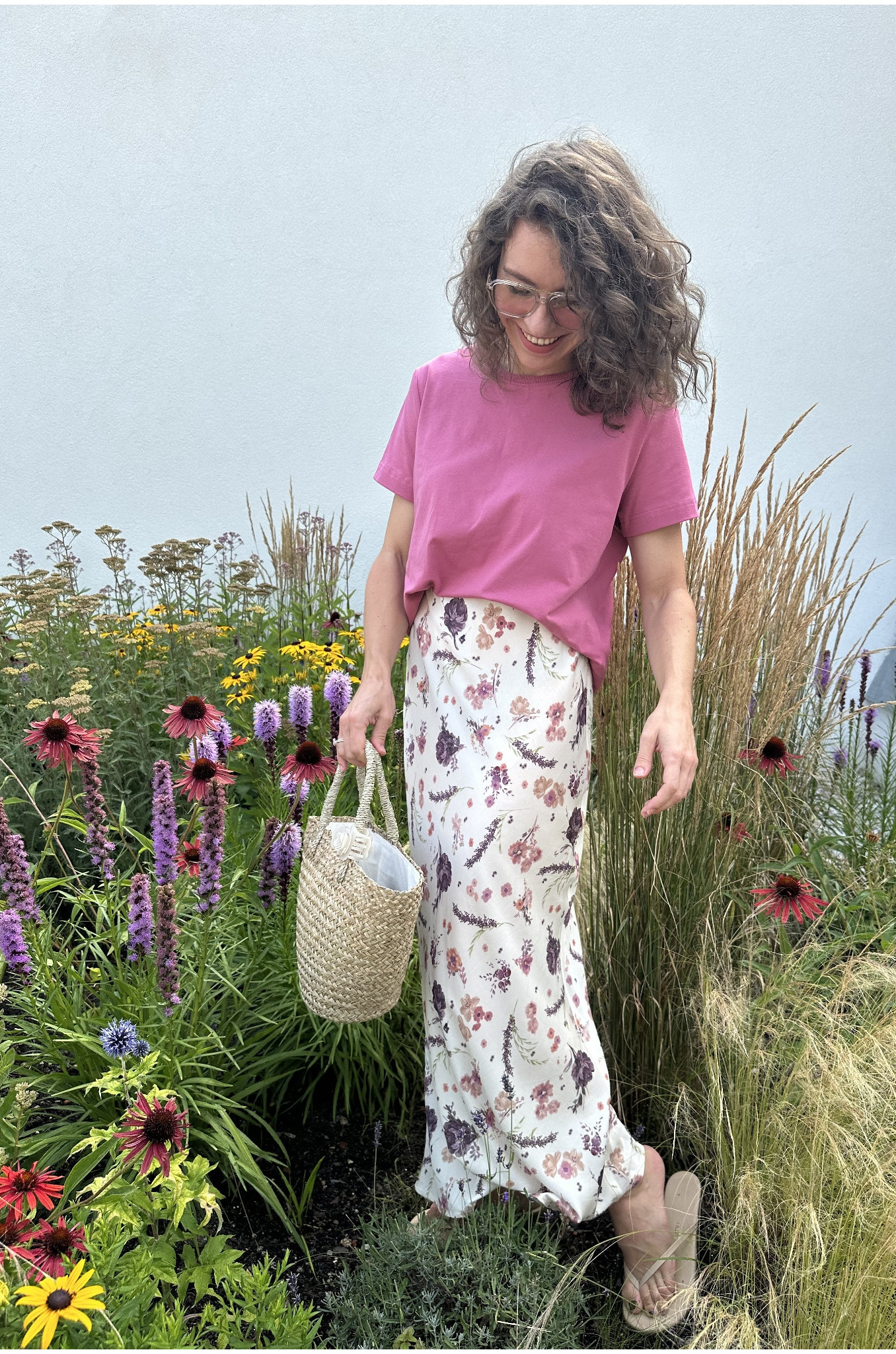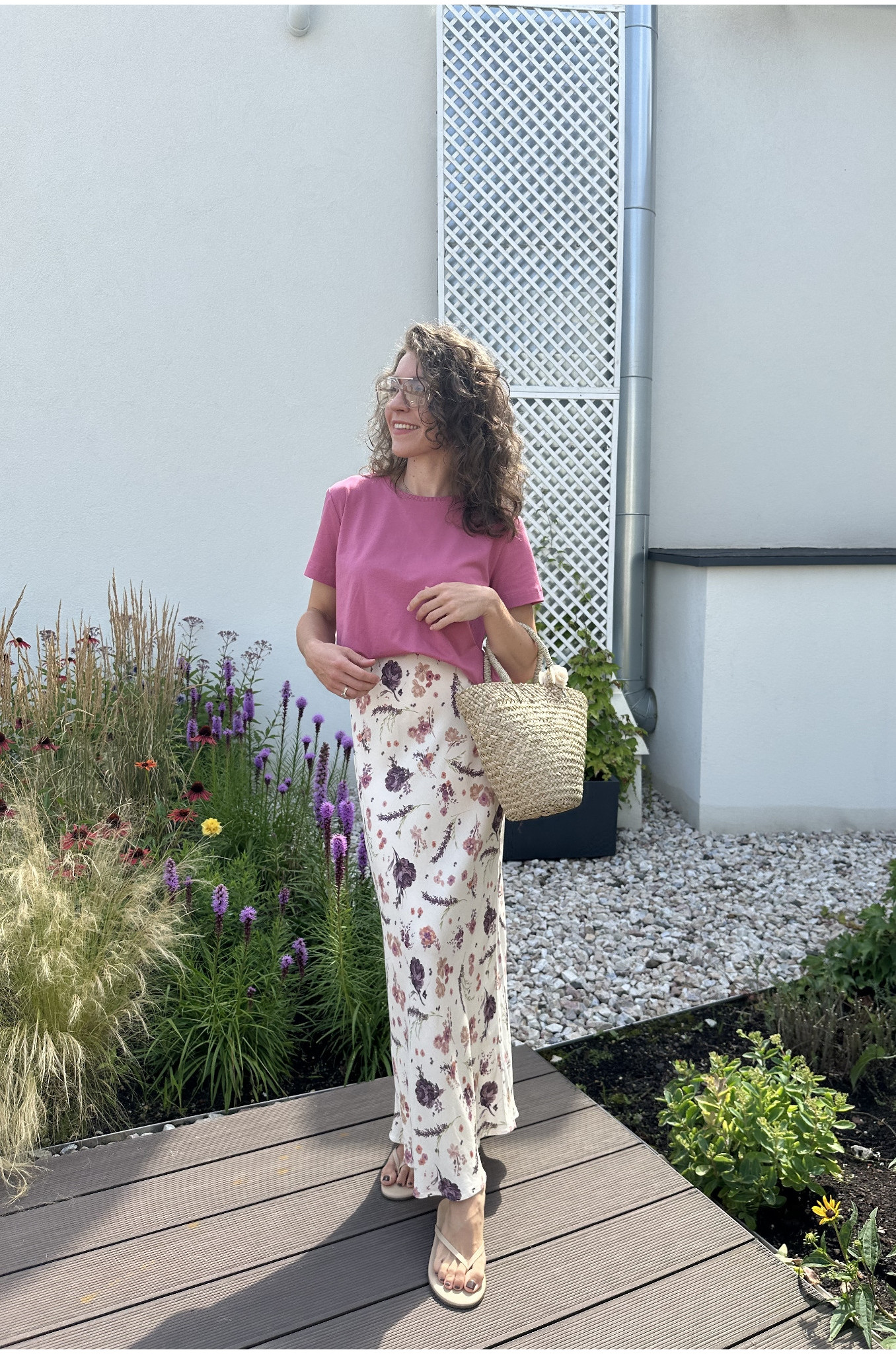 Zanurz się w romantycznym klimacie z naszą długą spódnicą ze skosu w delikatny, kwiatowy print. Wzór w odcieniach wrzosu, pudrowego różu i subtelnego fioletu na kremowym tle dodaje lekkości i kobiecego uroku. Lekki, lejący materiał pięknie układa się na sylwetce, a cięcie po skosie nadaje naturalnej miękkości w ruchu.