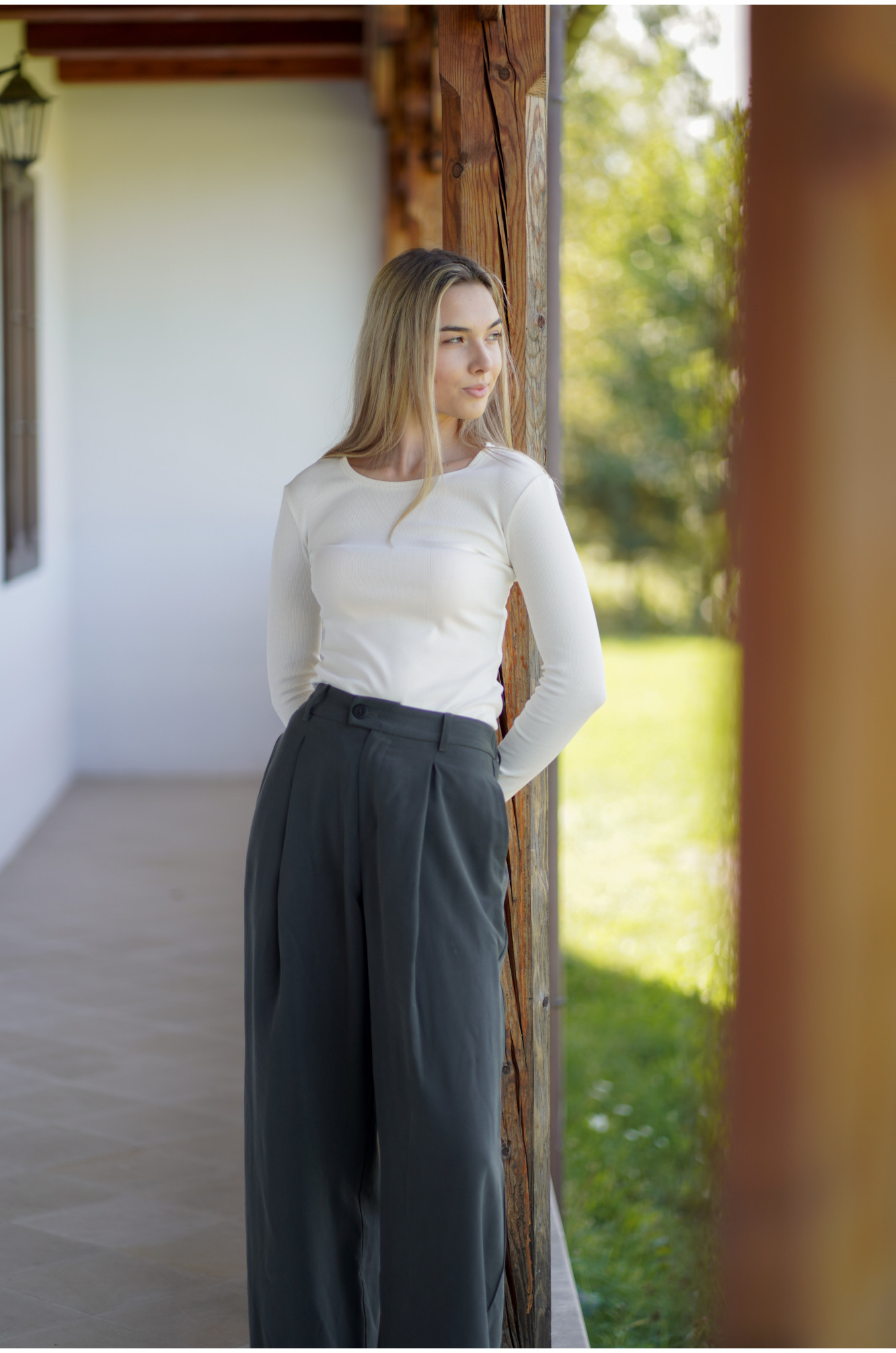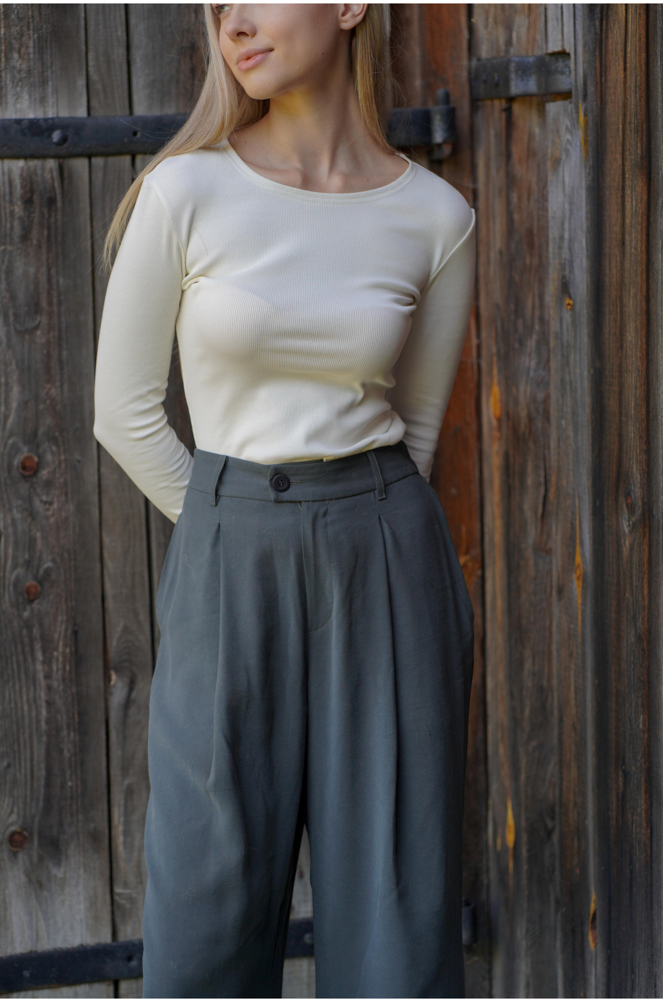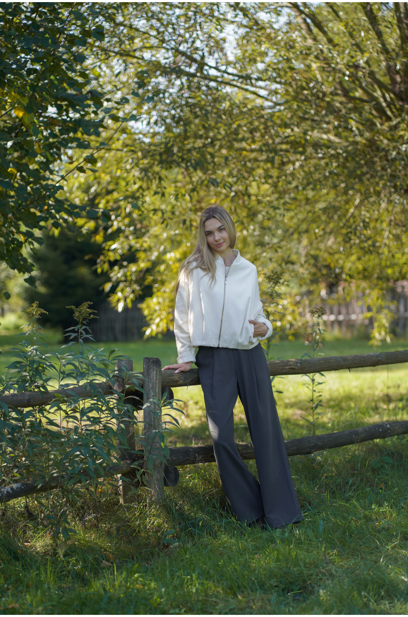 Modelka ma na sobie rozmiar S, a jej wzrost to 175 cm. Spodnie szyjemy 3 długościach