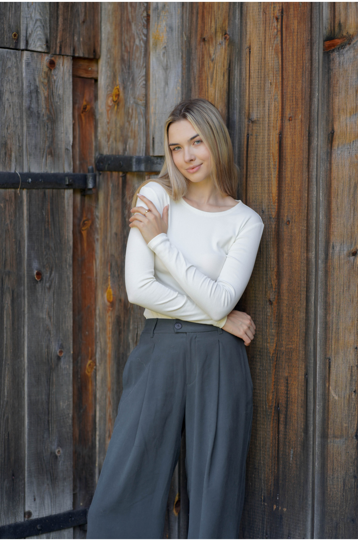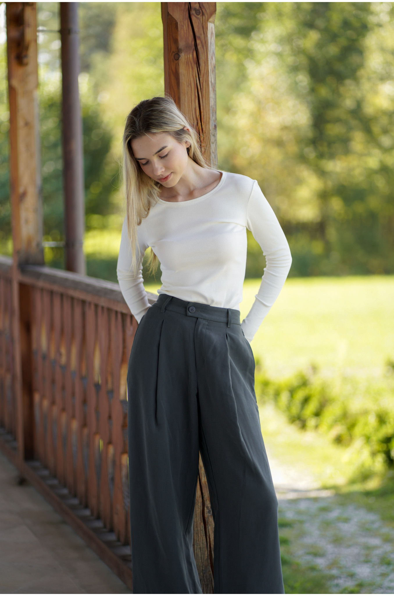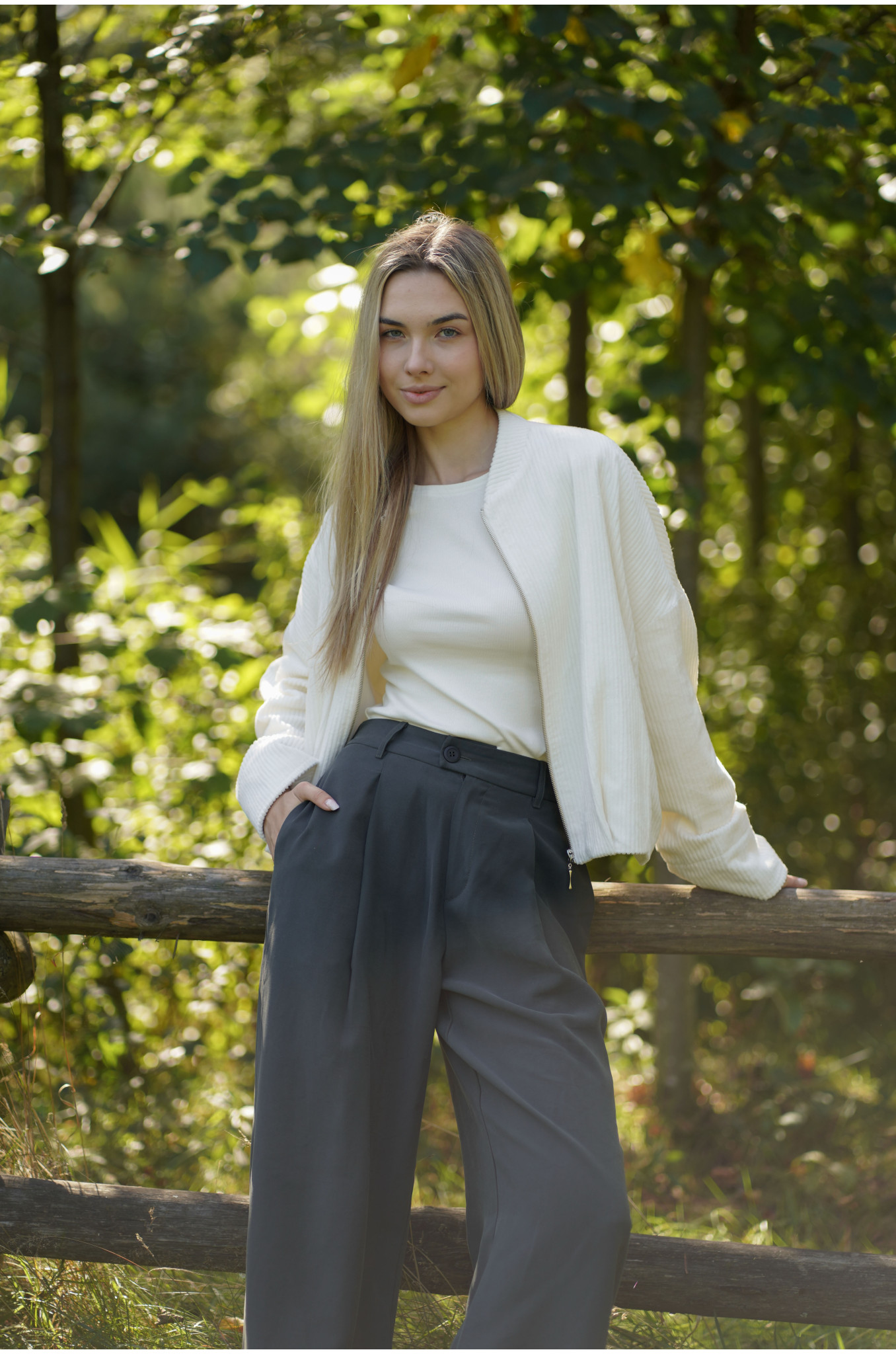 Modelka ma na sobie rozmiar S, a jej wzrost to 175 cm. Spodnie szyjemy 3 długościach