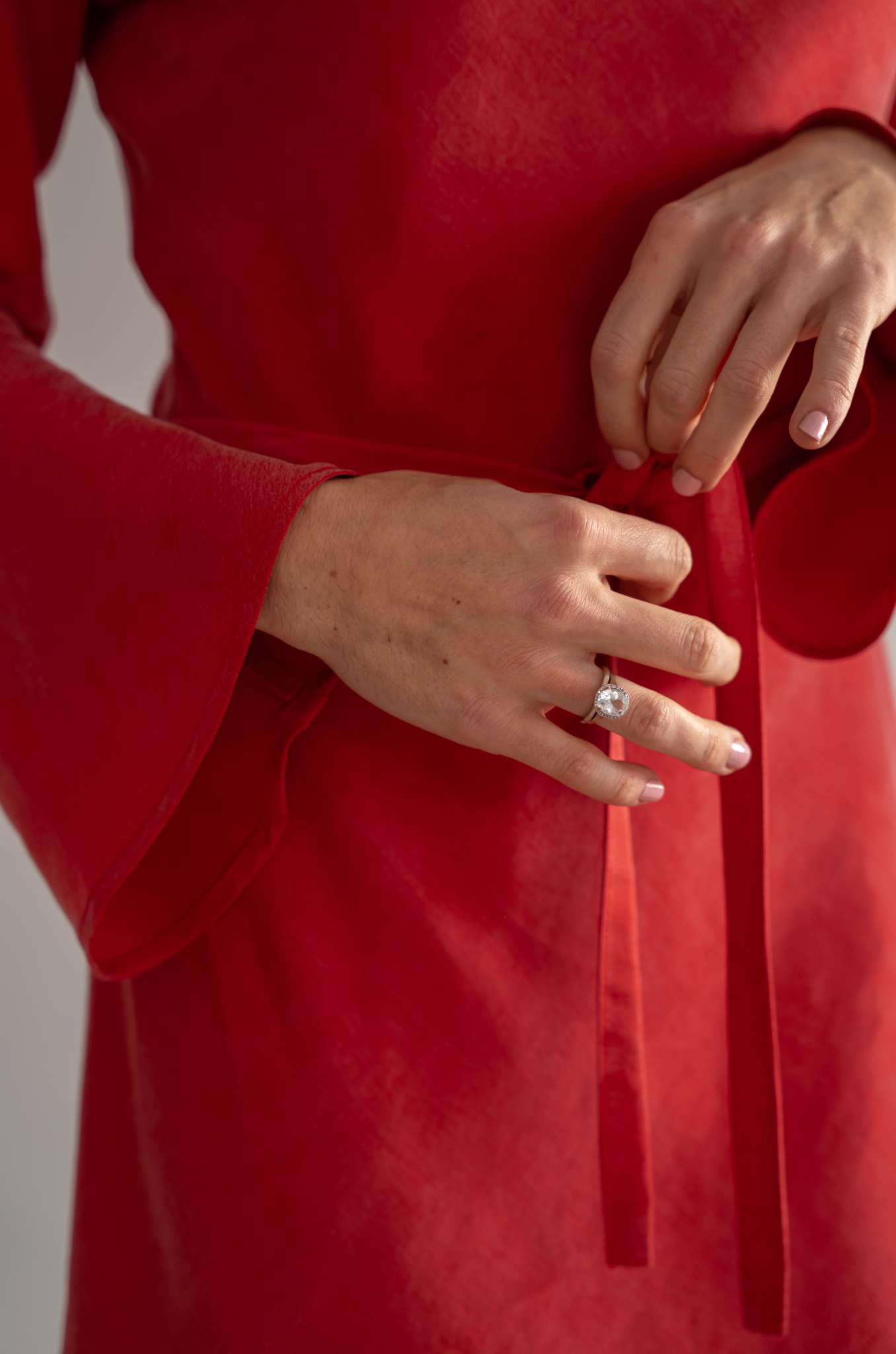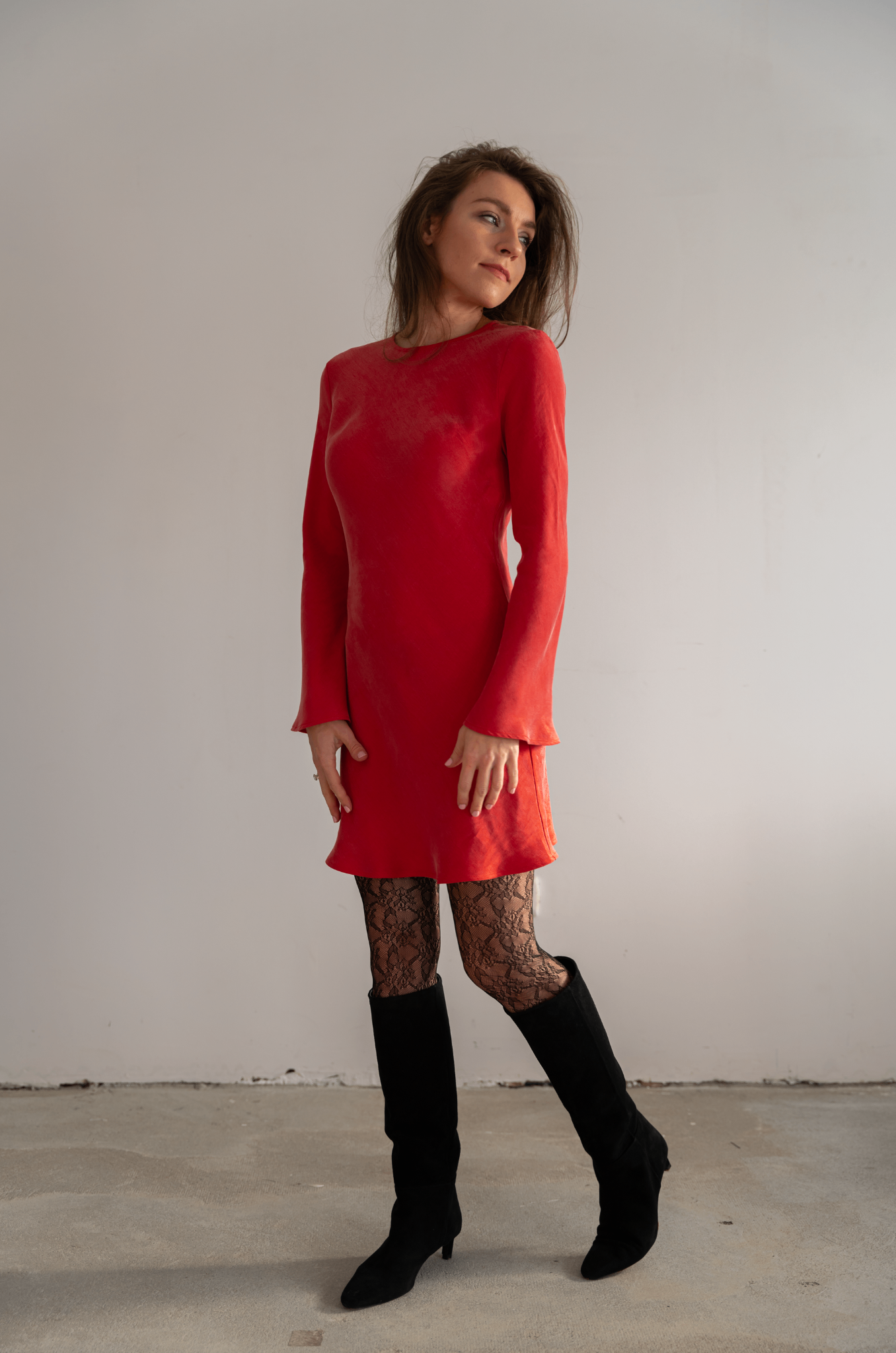 Poznaj czerwoną sukienkę Lana, wykonaną z mieszanki 47% lyocellu i 53% wiskozy – tkanin, które zapewniają komfort, lekkość i elegancję. Sukienka krojona ze skosu delikatnie opływa sylwetkę, podkreślając jej kształty. Rozszerzane rękawy nadają jej subtelny, romantyczny charakter, a zapięcie z tyłu na guziczek dodaje eleganckiego wykończenia.  Dodatkowym atutem jest modny print w zeberkę, który przyciąga wzrok i nadaje całości wyrazistości. Tkanina o delikatnej, vintage'owej fakturze czyni tę sukienkę wyjątkową, idealną zarówno na co dzień, jak i na bardziej eleganckie wyjścia.