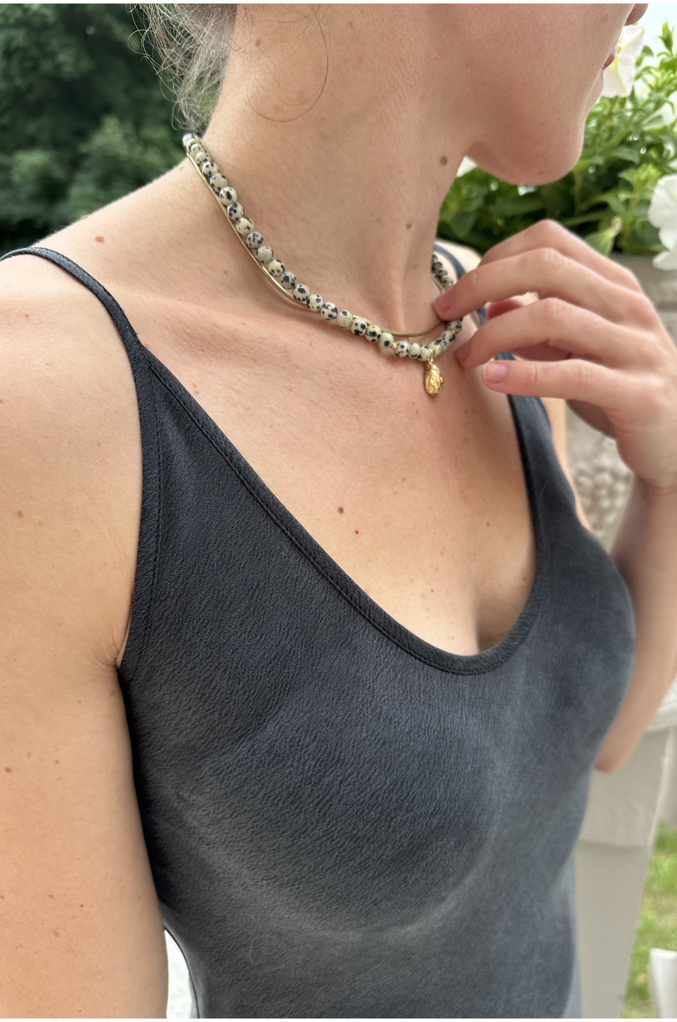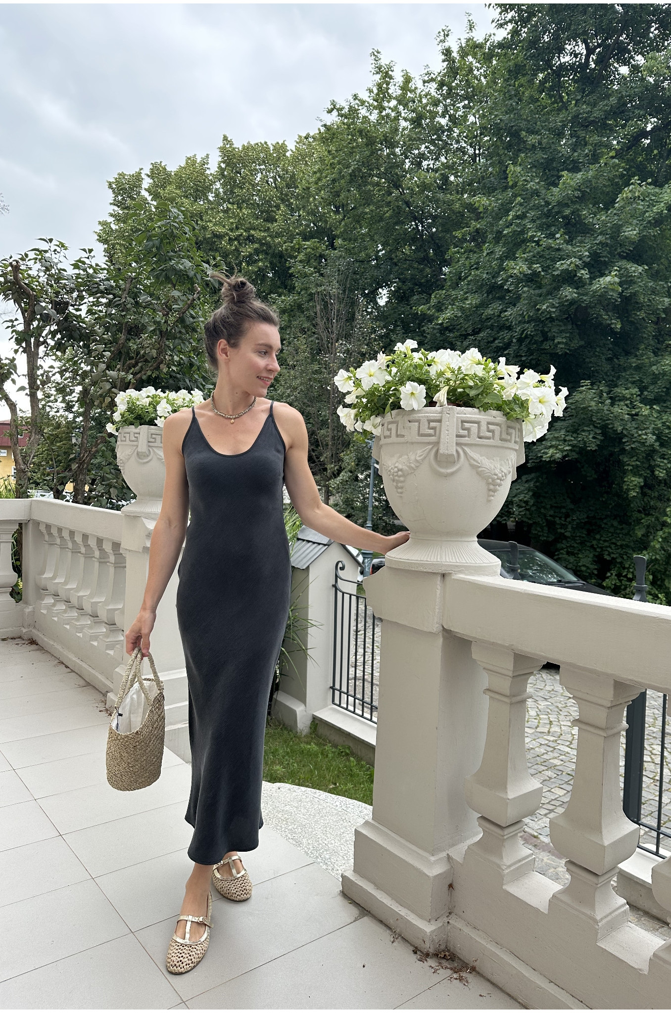 Szykowna i pełna swobody – ta długa sukienka została skrojona ze skosu, dzięki czemu miękko układa się na sylwetce, podkreślając jej naturalny ruch. Cienkie ramiączka z regulacją pozwalają idealnie dopasować długość, a delikatna gumka wszyta z tyłu na plecach subtelnie podtrzymuje górę sukienki, zapewniając komfort noszenia przez cały dzień.