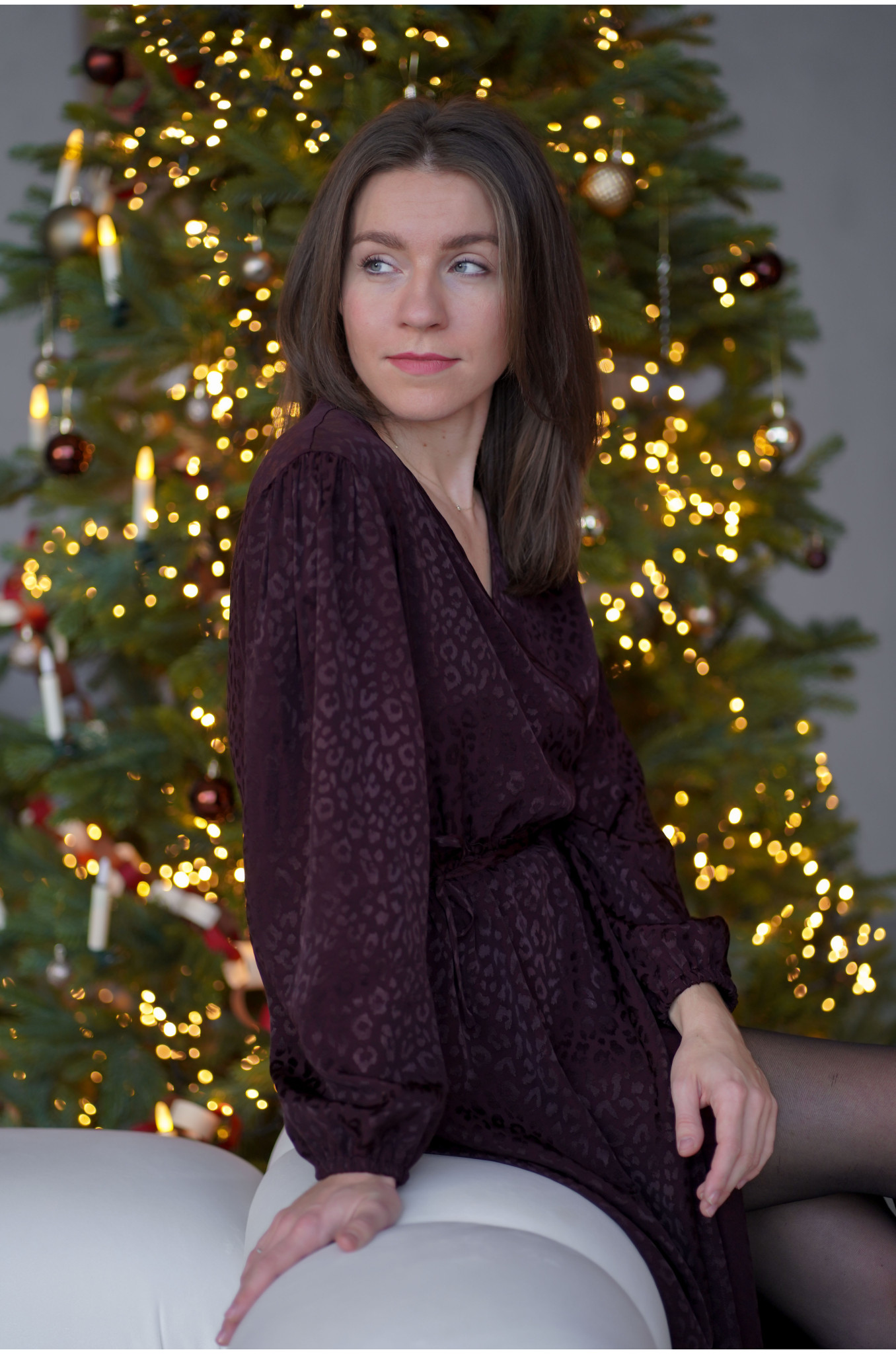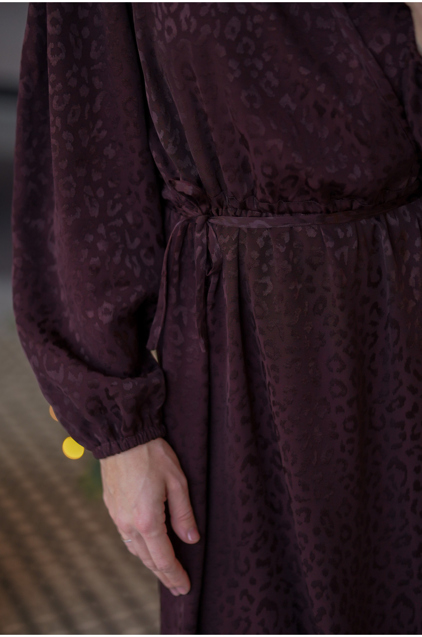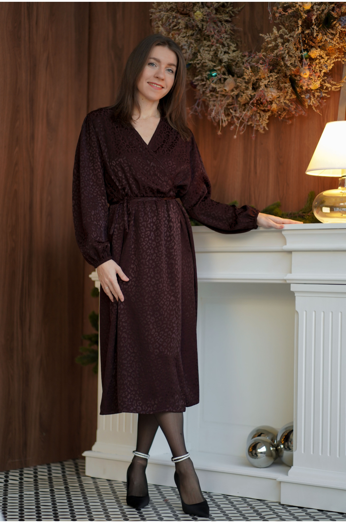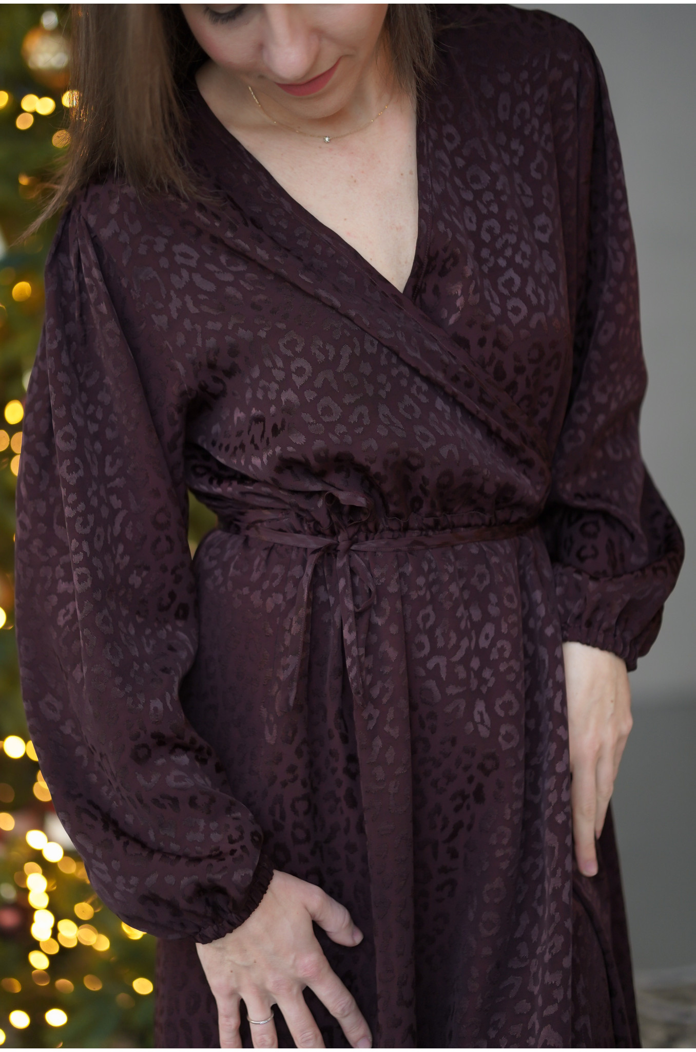 Sukienka Wrap Panter to kopertowy model midi wykonany z żakardowej tkaniny w brązowy wzór pantery, który subtelnie odbija światło i nadaje stylizacjom eleganckiego charakteru. Kopertowy fason pozwala pięknie podkreślić talię i biust, jednocześnie pozostając bardzo komfortowym w noszeniu.