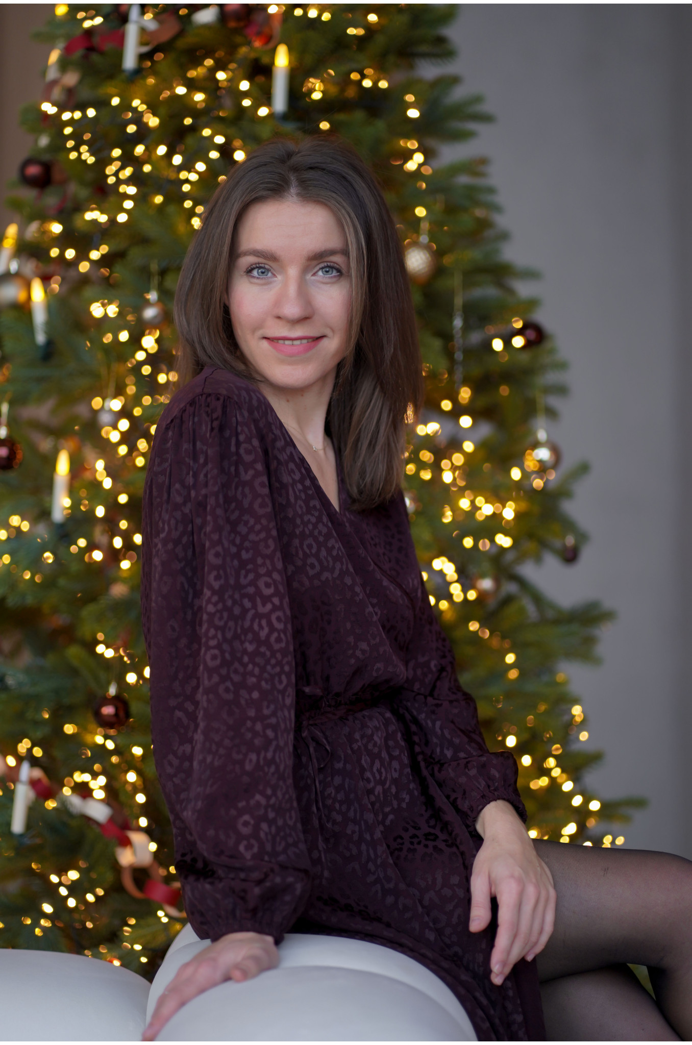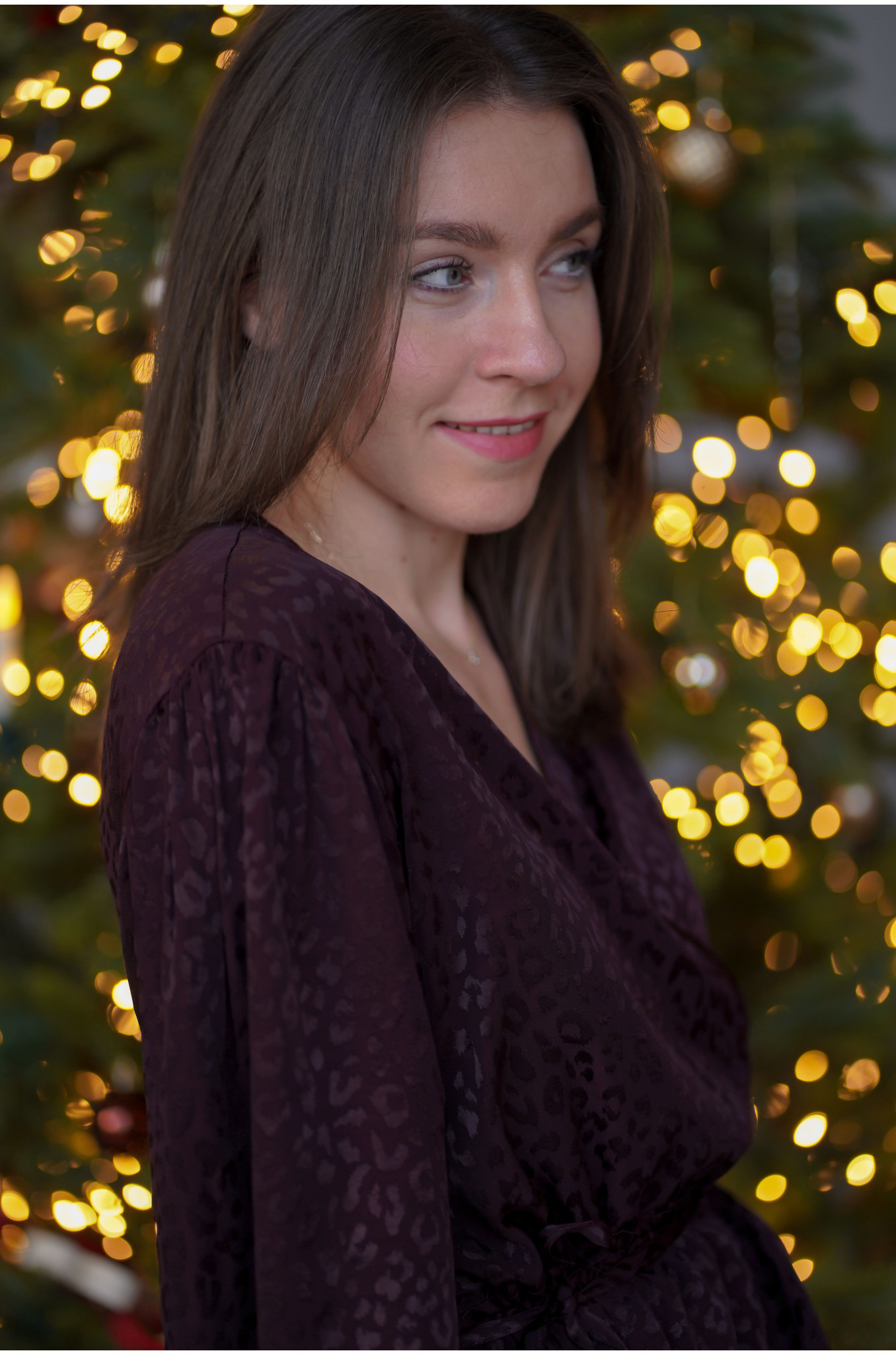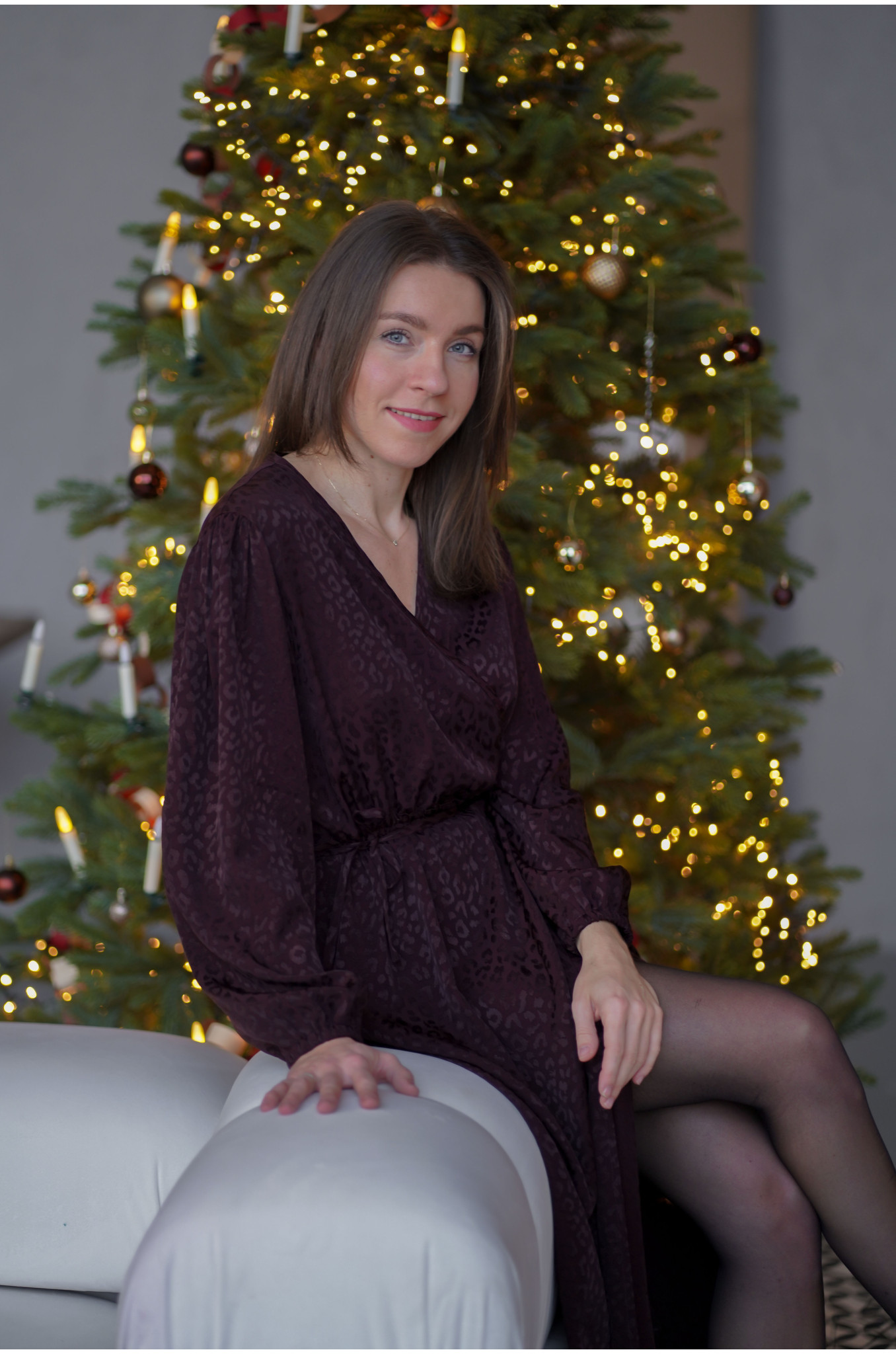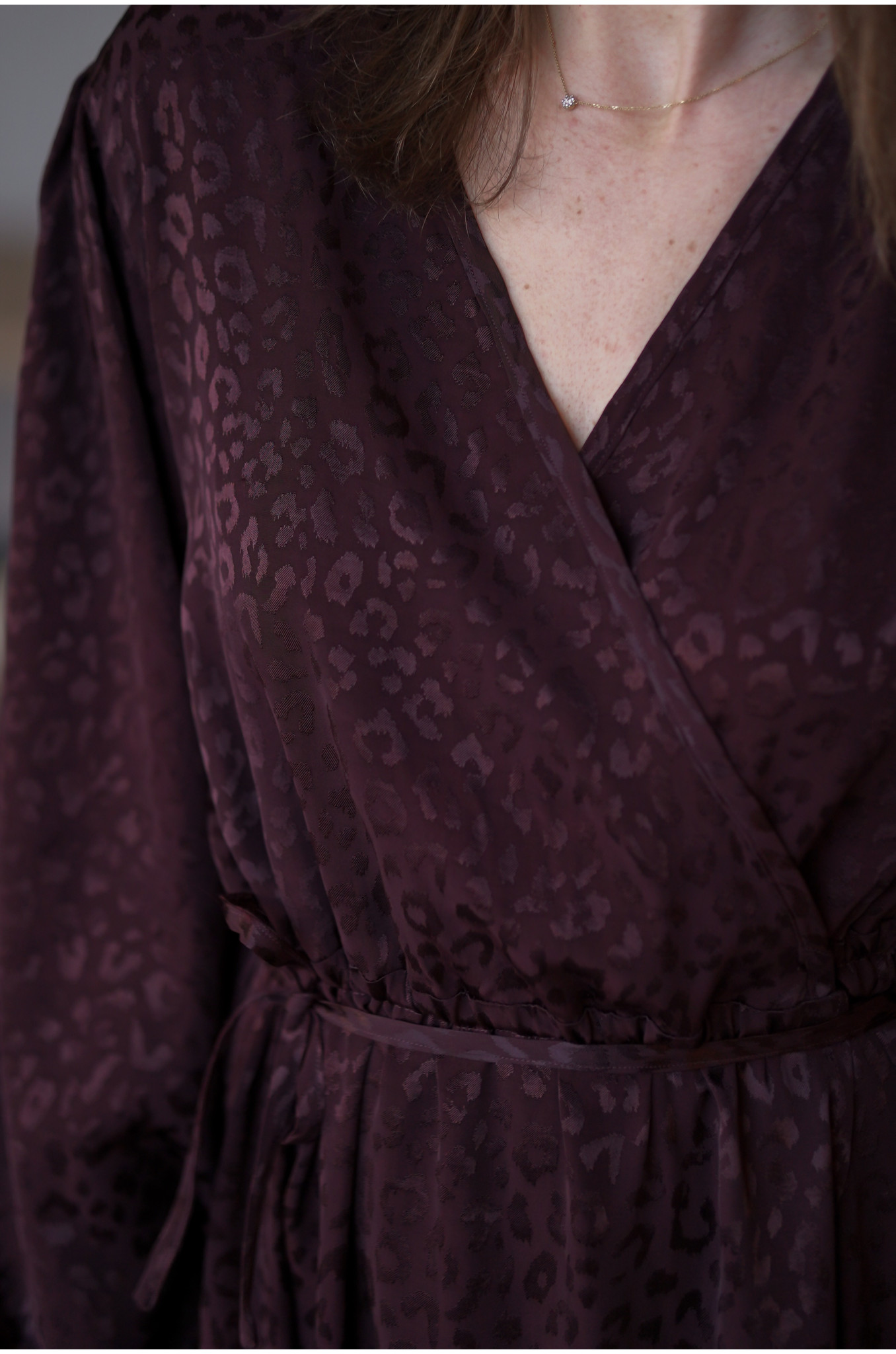 Sukienka Wrap Panter to kopertowy model midi wykonany z żakardowej tkaniny w brązowy wzór pantery, który subtelnie odbija światło i nadaje stylizacjom eleganckiego charakteru. Kopertowy fason pozwala pięknie podkreślić talię i biust, jednocześnie pozostając bardzo komfortowym w noszeniu.