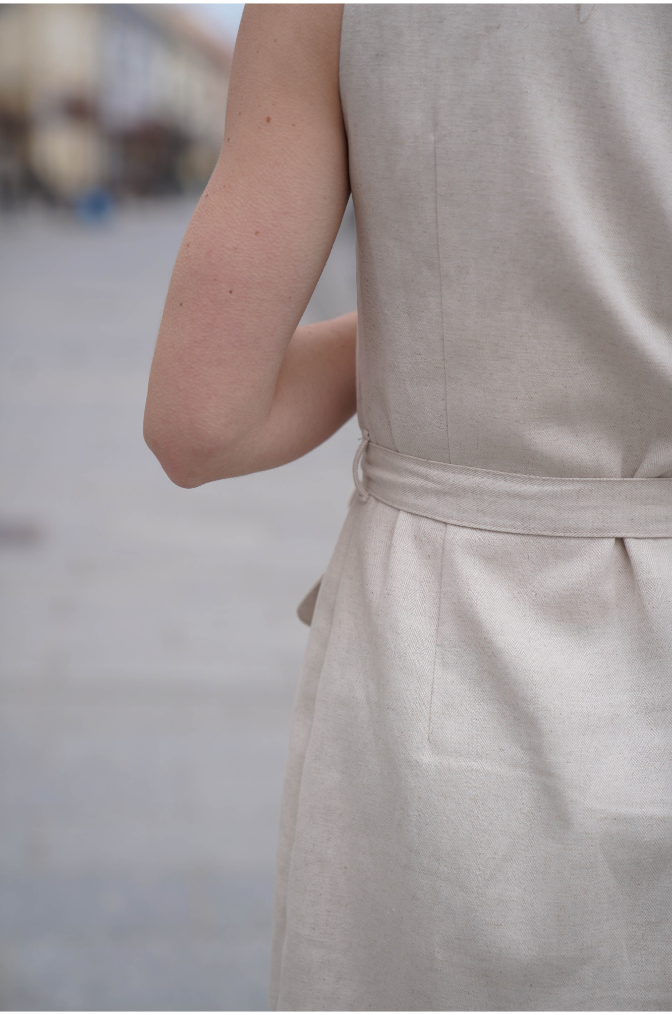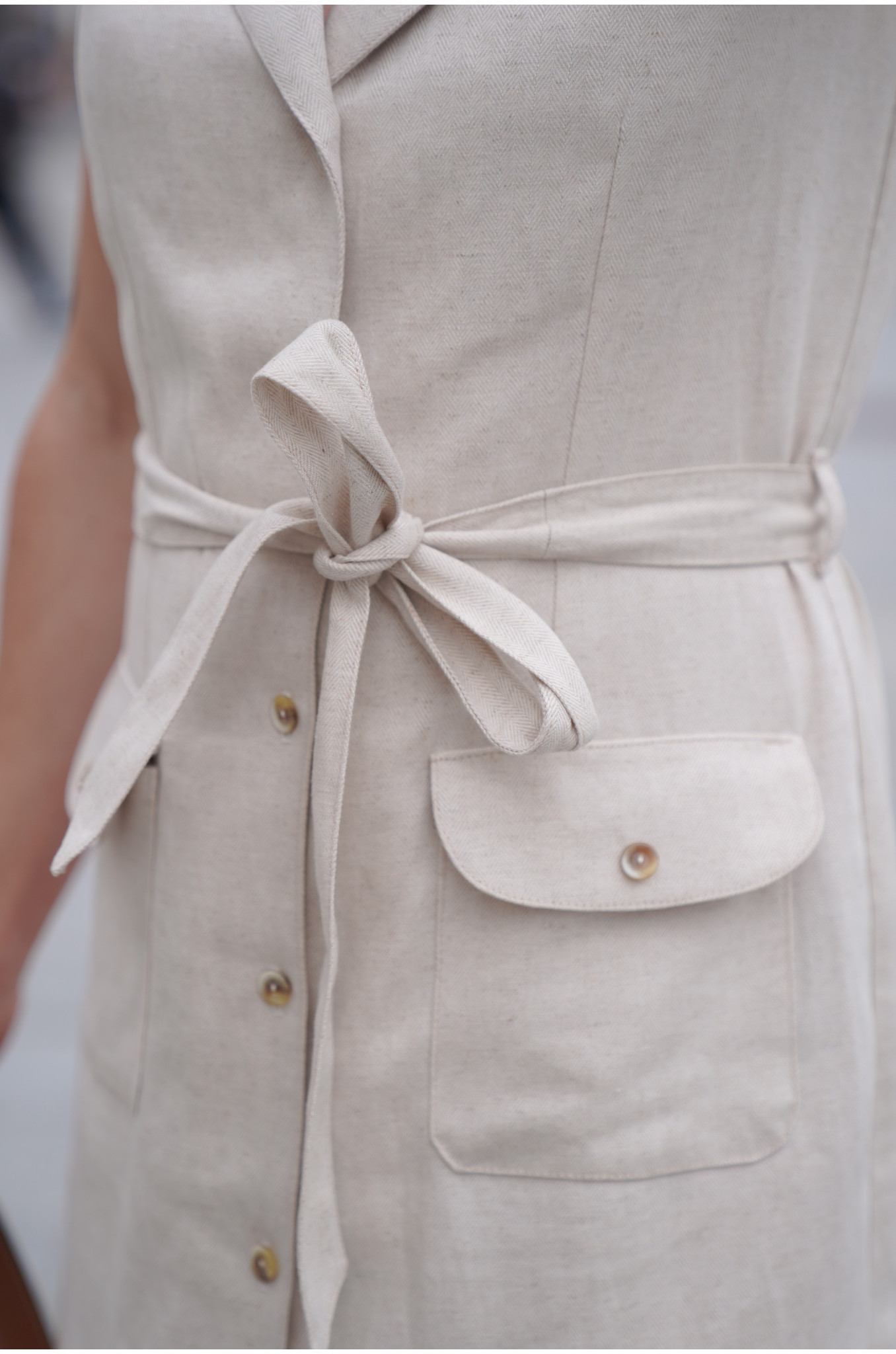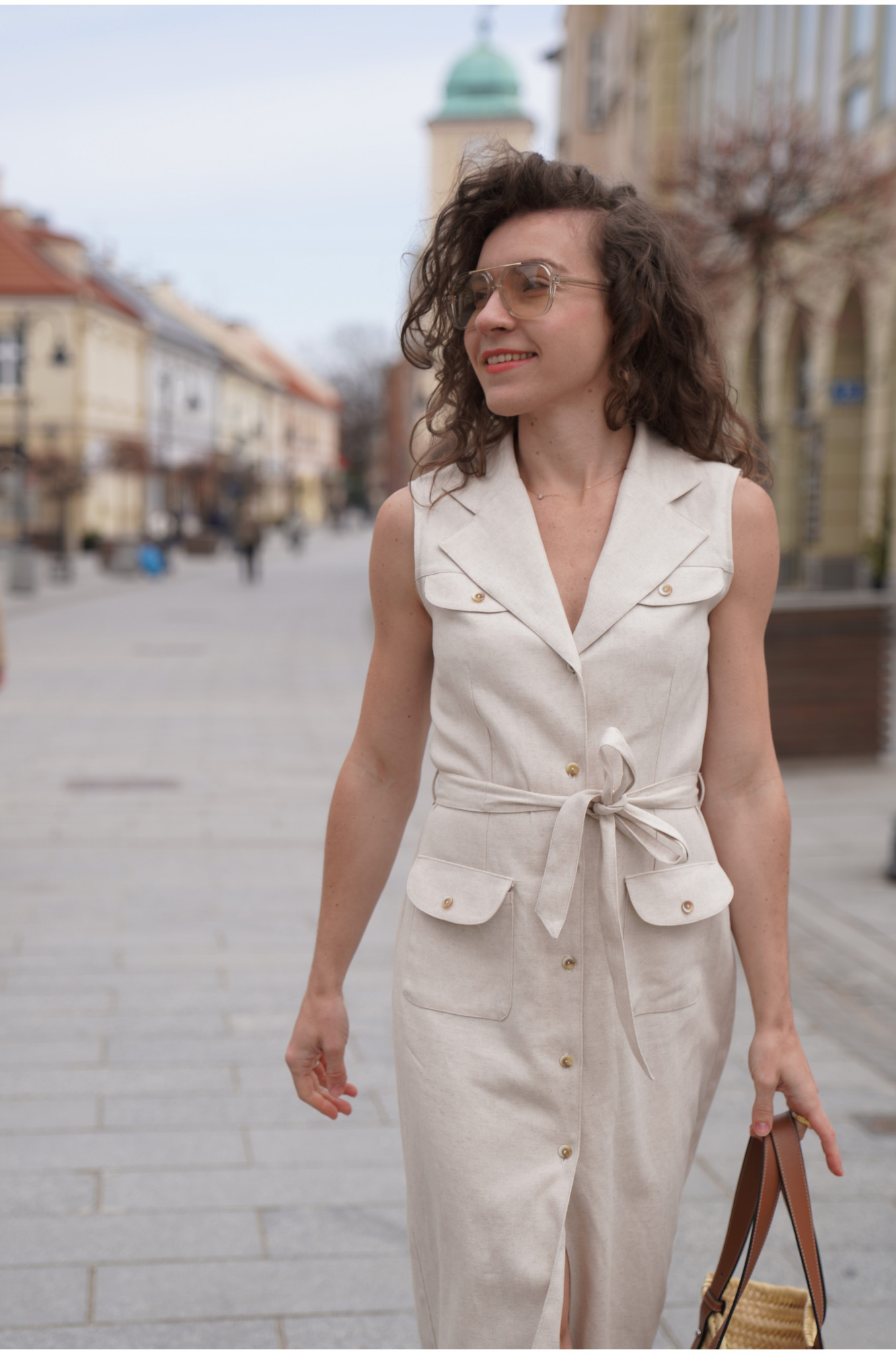 Stylowa szmizjerka inspirowana klasycznym fasonem marynarki to ponadczasowa propozycja, która łączy elegancję z nowoczesnym charakterem. Sukienka wyróżnia się dopracowanymi detalami - ozdobne patki, klasyczny kołnierz oraz subtelne kieszonki, które podkreślają jej strukturalny, marynarkowy styl.